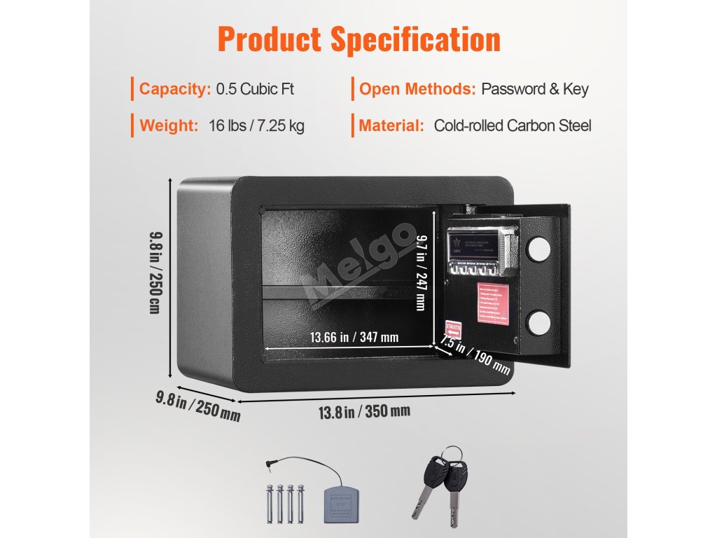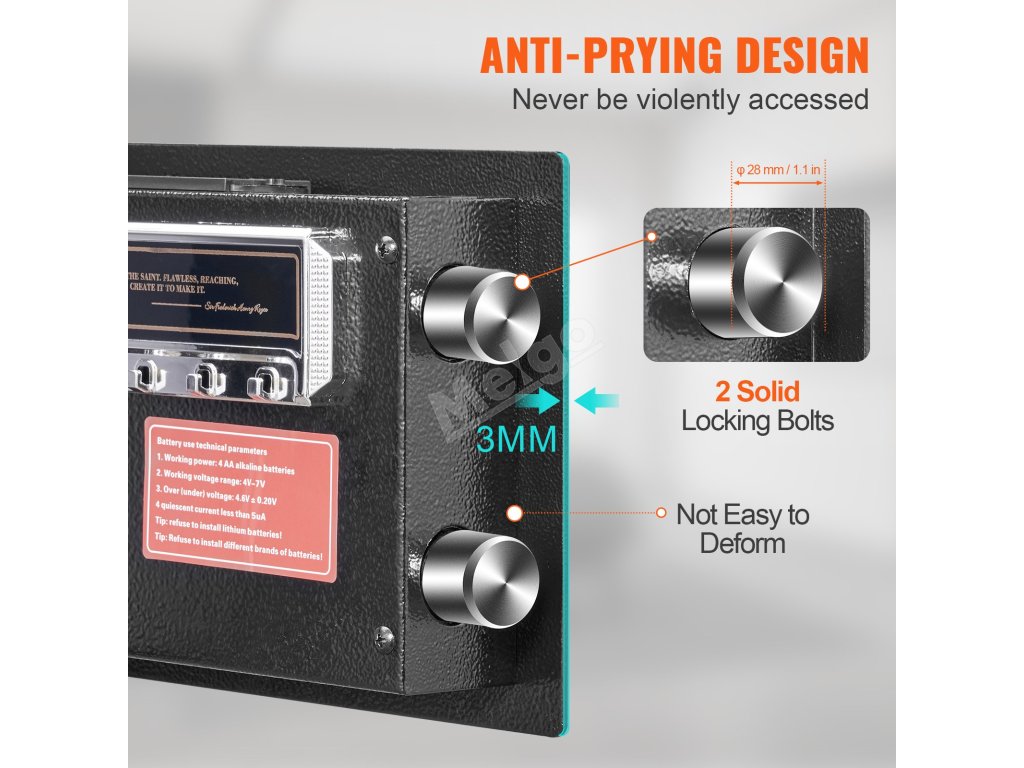 Je skonštruovaný tak, aby vydržal. Pevný materiál a pevná konštrukcia sťažujú prístup narušiteľom. 0.dvere s hrúbkou 1 palec a uzamykacie skrutky s priemerom 1,1 palca zvyšujú úroveň zabezpečenia. Táto odolná konštrukcia zaručuje, že vaše cennosti budú dobre chránené. Aj keď nie je ohňovzdorný ani vodotesný, robustná konštrukcia poskytuje pokoj, vďaka čomu je spoľahlivou voľbou pre zabezpečenie domácnosti. Vysokokvalitné materiály použité v jeho konštrukcii pomáhajú odradiť náhodných zlodejov a udržať vaše veci v bezpečí.