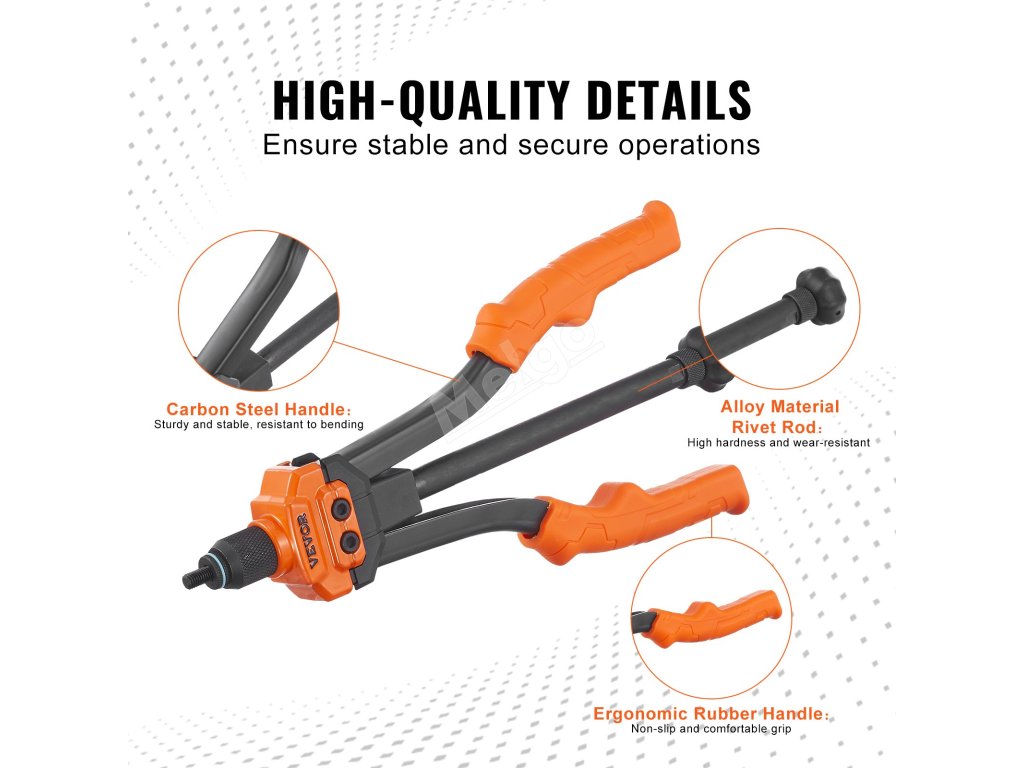 Náš nýtovací nástroj je vyroben tak, aby vydržel, a je vybaven nastavovací tyčí z vysoce tvrdé slitiny a rukojetí z uhlíkové oceli pro spolehlivé a stabilní výsledky nýtování. Pohodlná rukojeť vám také zpříjemní práci.
