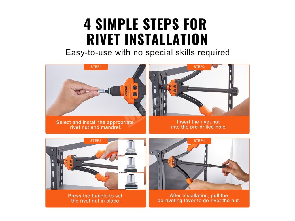 Pomocí pouhých 4 jednoduchých kroků můžete snadno zvládnout různé nýtovací úkoly. Pohodlné roznýtování vyžaduje pouze zatažení za páku pro roznýtování matice, což šetří čas a námahu. Ať už jste začátečník, nebo zkušený profesionál, rychle si s tím poradíte.