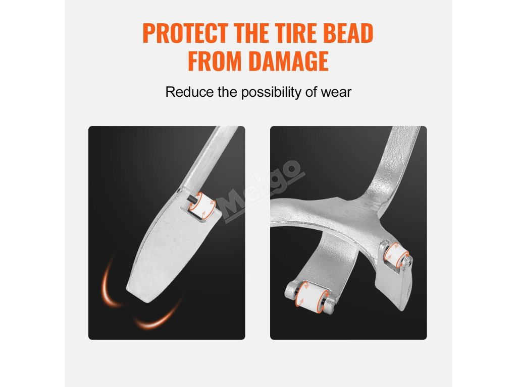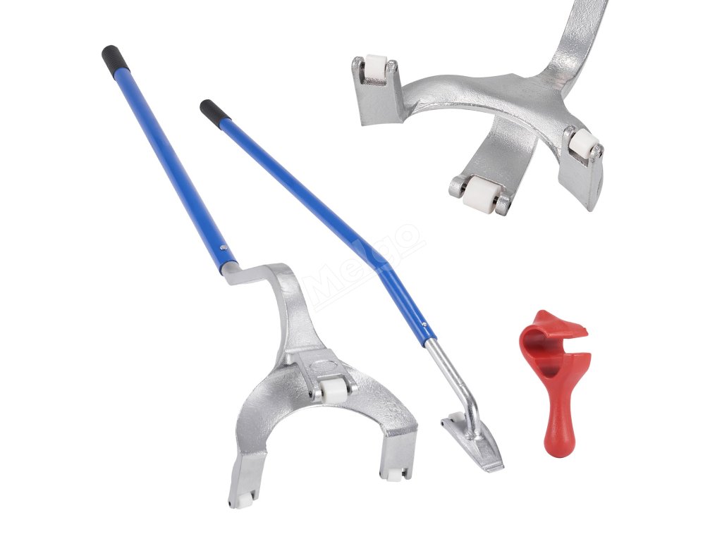 Demontážní nástroj s nylonovými válečky a hladkými hranami vás ochrání před zraněním a zajistí, aby se vaše pneumatiky, ráfky a nářadí nepoškodily. Doporučujeme při práci používat vhodné mazání, aby se minimalizovalo tření.