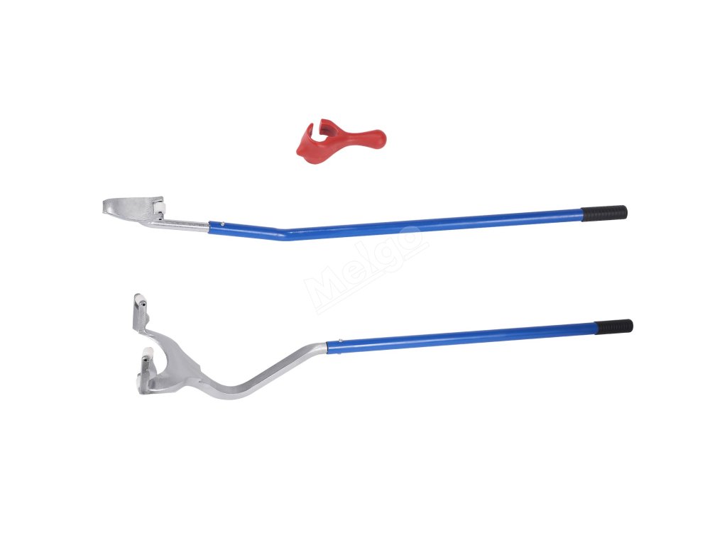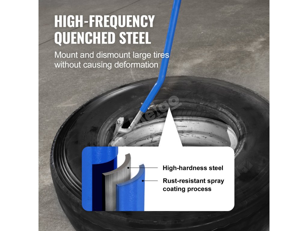 Nástroj na demontáž pneumatik je vyroben z vysokoteplotní kované oceli, která zajišťuje robustní a pevnou konstrukci odolnou proti deformaci a křehnutí. Povrch je ošetřen nástřikem pro zvýšení odolnosti proti korozi a rzi.