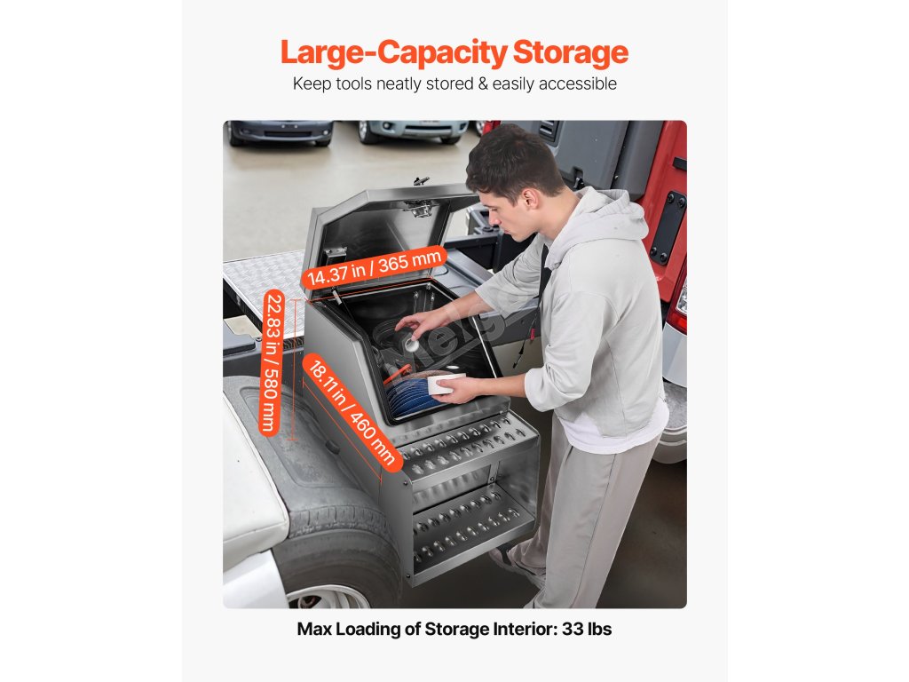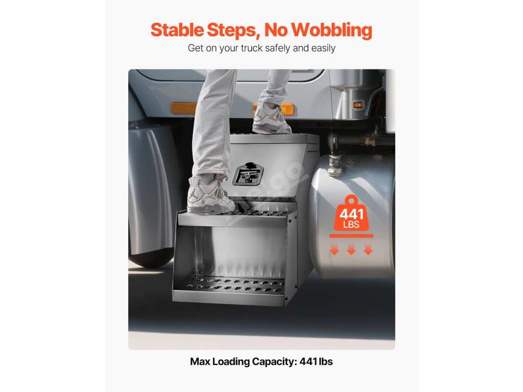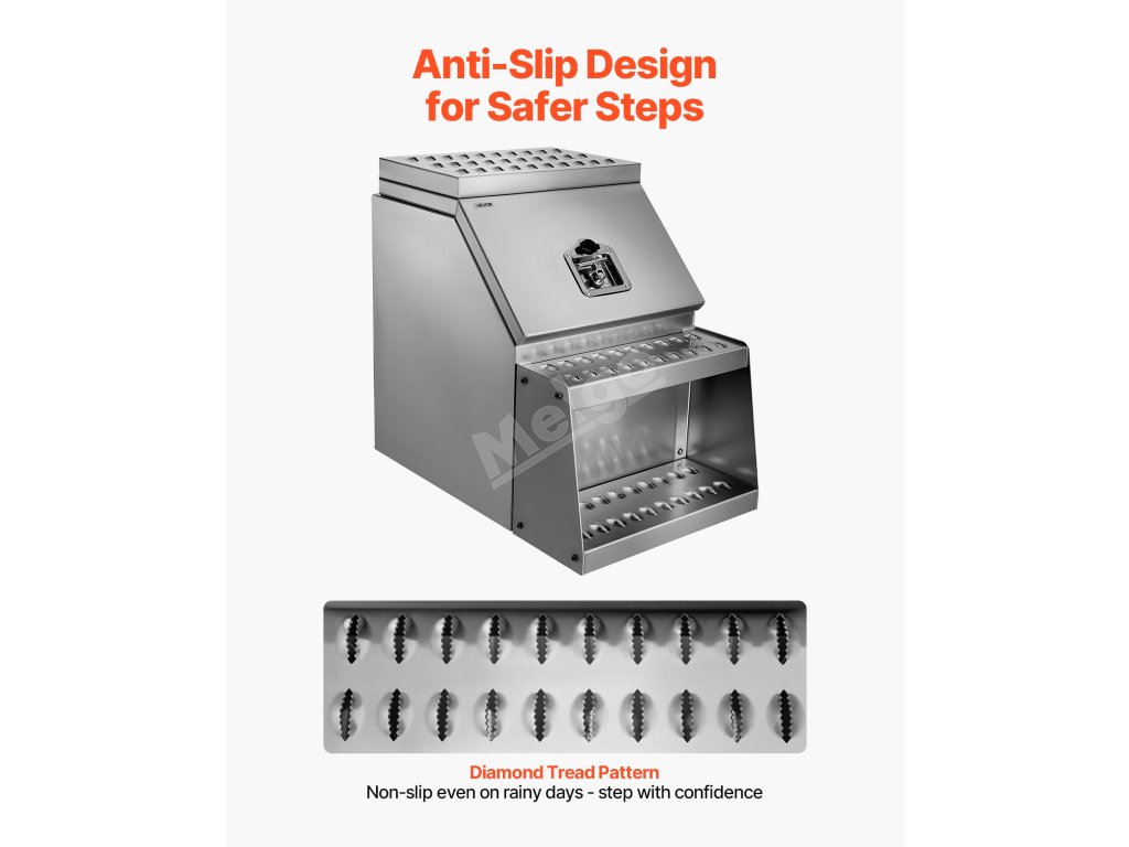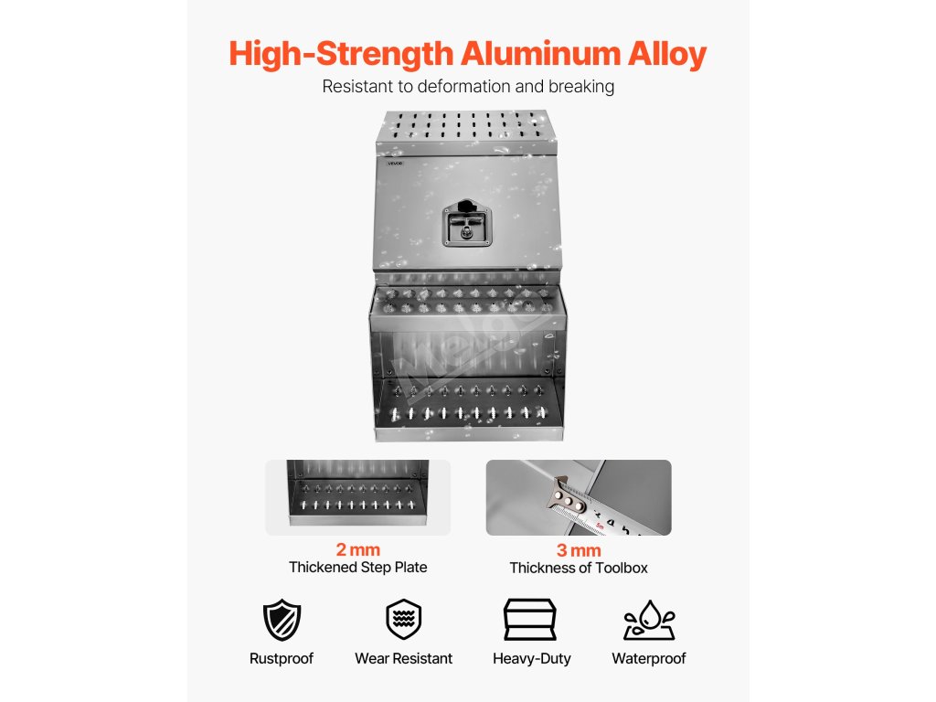 Skříň na nářadí VEVOR se schůdky pro návěsy kombinuje odolnou konstrukci, bezpečné schůdky a bezpečné uložení v jednom univerzálním zařízení. Je vyrobena z vysoce odolné hliníkové slitiny, unese až 200 kg, což zajišťuje stabilní nastupování a vystupování řidičů, a má prostorný vnitřní úložný prostor s uzamykáním a přístupem na klíč.