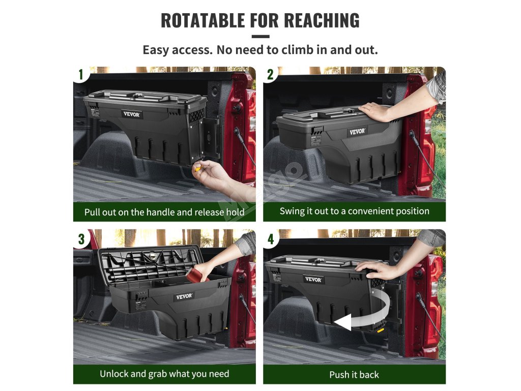 Úložný box můžete umístit na stranu řidiče nebo spolujezdce a získat tak dostatek prostoru pro své cestovní potřeby. Pohodlně se vysouvá a zasouvá. Není třeba lézt do lůžka, jak to vyžaduje většina boxů.