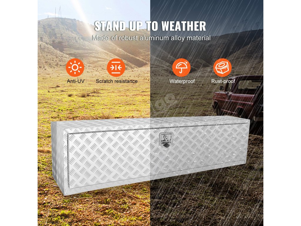 Podvozkový box na nákladné vozidlá VEVOR je ideálny na uskladnenie ťažkých predmetov. Jeho pevná hliníková konštrukcia unesie až 110 kg. Vďaka tomu je ideálny na náradie, batérie a ďalšie nevyhnutné veci. Tento box je vyrobený z hrubého hliníka a zaručuje odolnosť. Môžete ho bezpečne namontovať pod nákladné vozidlo alebo príves. Konštrukcia boxu zaručuje, že sa pod zaťažením nebude prehýbať ani ohýbať. Je box spoľahlivým riešením pre potreby ľahkého aj ťažkého skladovania? Áno, môžete sa spoľahnúť, že vaše predmety budú v bezpečí. Vďaka svojej ťažkej konštrukcii dokáže zvýšiť hodnotu každého vozidla.