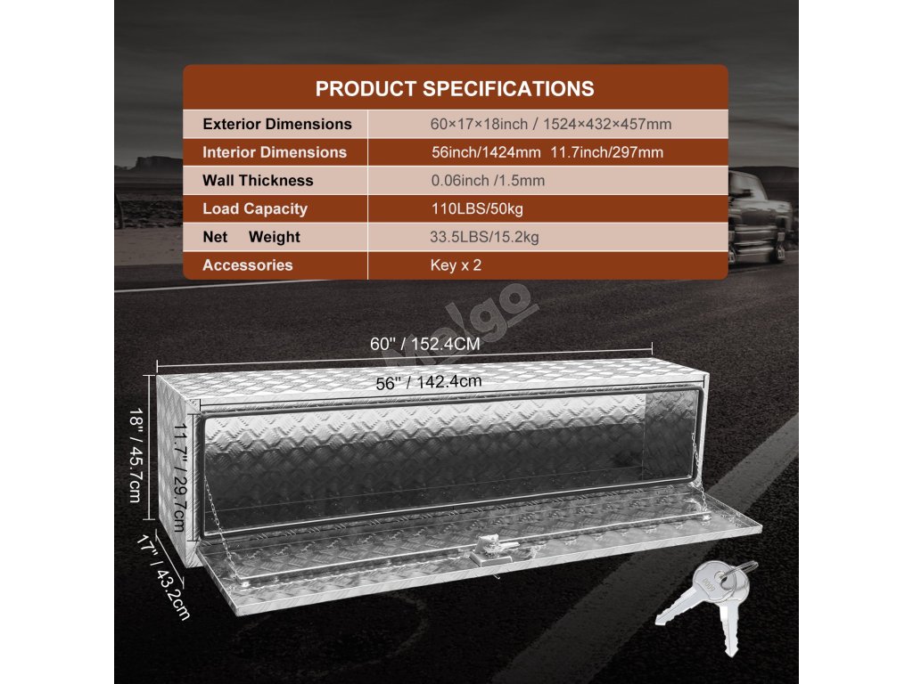 Box na náradie VEVOR s T-rukoväťou a západkou sa dodáva v rôznych rozmeroch. Z vonkajšej strany má rozmery 60 × 17 × 18 palcov. Vnútorné rozmery sú 56x11,7 palca. Vďaka týmto rozmerom je vhodný pre rôzne vozidlá. Môžete ho nainštalovať pod nákladné vozidlá, dodávky a prívesy. Rozmery boxu zaručujú, že sa doň bez problémov zmestí. Aj vďaka jeho ľahkej konštrukcii sa s ním ľahko manipuluje a ľahko sa inštaluje. Táto univerzálna konštrukcia znamená, že sa dá použiť na rôzne účely. Zistili sme tiež, že tento nástroj dokáže bez problémov splniť potreby uskladnenia vozidla. Môžete sa teda spoľahnúť, že sa dokonale prispôsobí vášmu vozidlu.