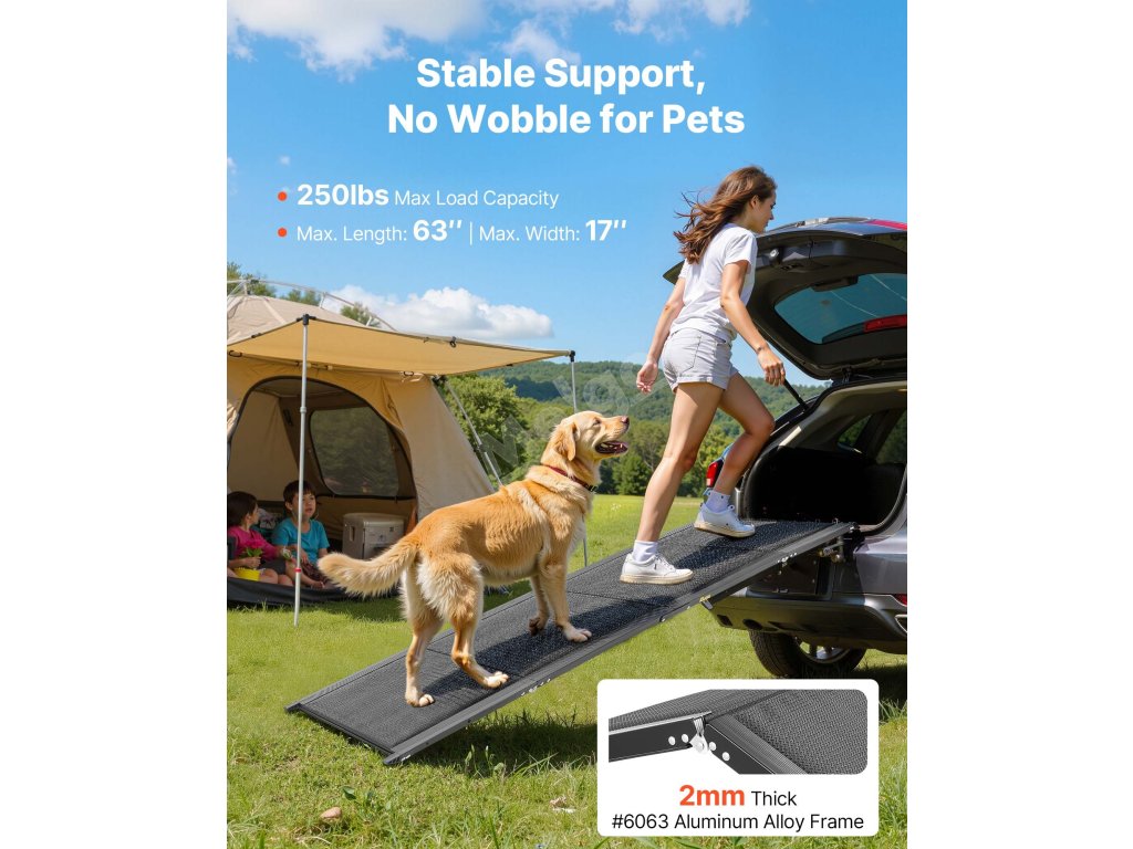 Tato 63palcová prodloužená rampa pro domácí mazlíčky s vysoce pevným hliníkem 6063 a 2mm zesíleným rámem unese až 250 kg. Robustní konstrukce zabraňuje houpání a protiskluzový povrch udržuje stabilitu domácích zvířat při pohybu nahoru nebo dolů.