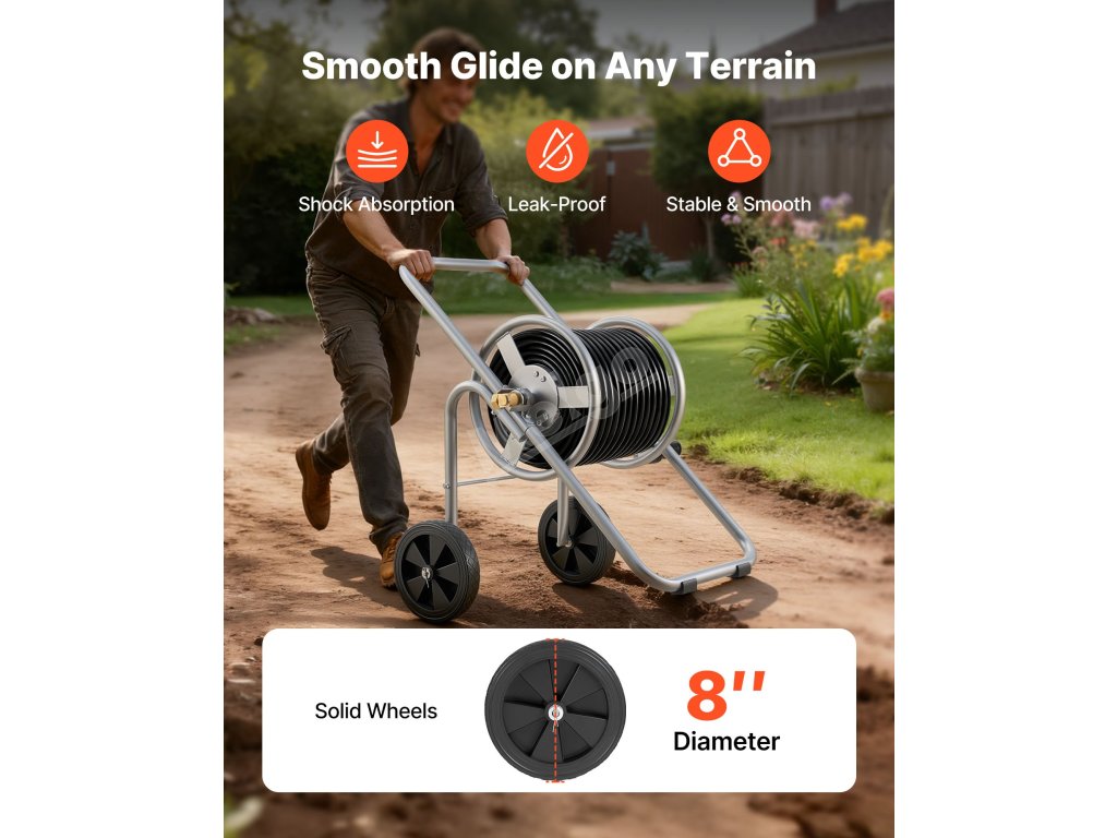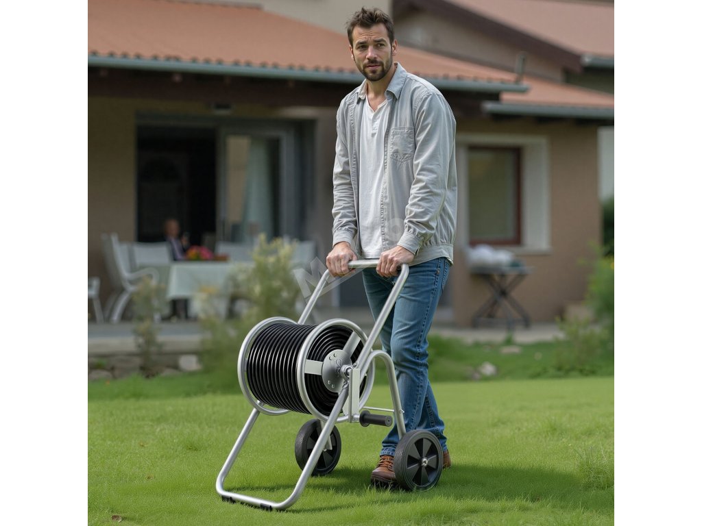 Tento vozík na hadici na kolečkách je vybaven robustními pevnými koly a ergonomickým designem, takže se snadno pohybuje i při velkém zatížení. Jeho robustní konstrukce zajišťuje snadnou manipulaci a přizpůsobivost na různých površích, takže je ideální pro profesionální nebo vysoce náročné venkovní úkoly.
