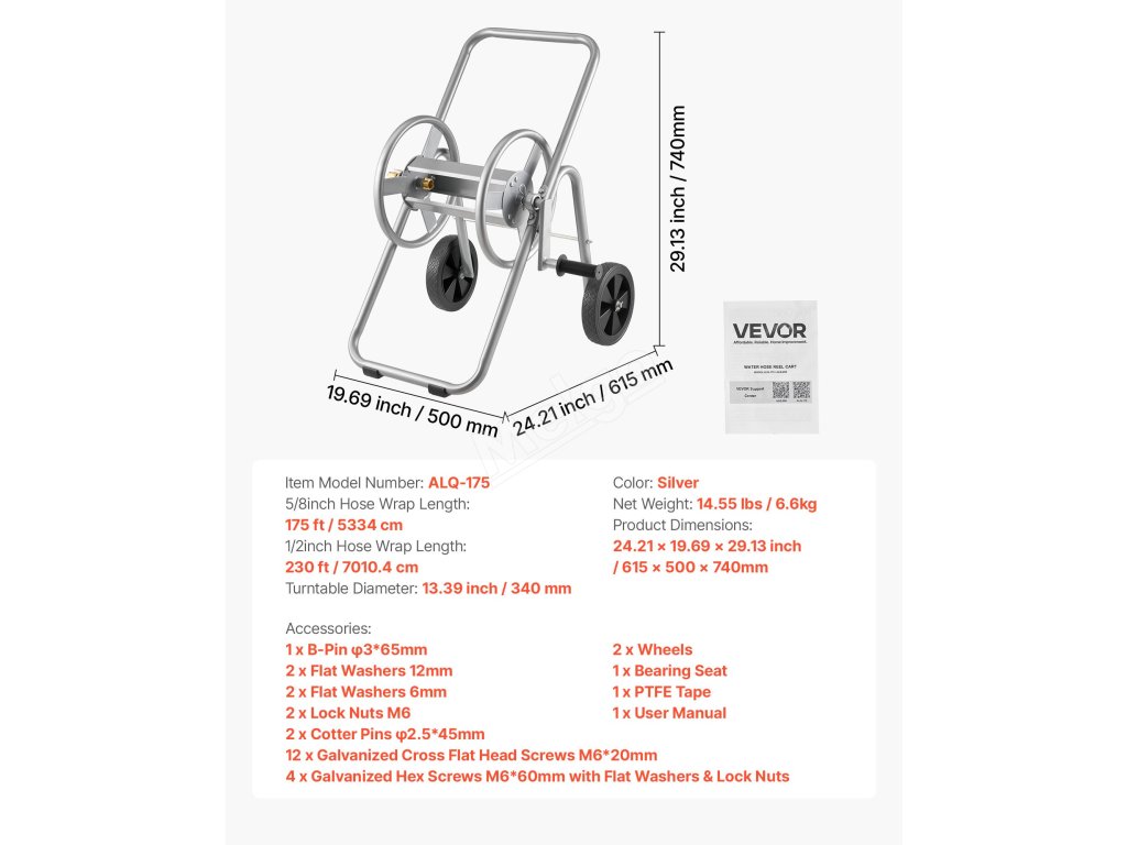Tento vozík s navijákem na vodní hadici je vyroben z oceli Q235A s mosaznými armaturami a pojme 230 stop (7010,4 cm) hadice 1/2" (12,7 mm) nebo 175 stop (5334 cm) hadice 5/8" (15,88 mm). Díky převodovému navijáku se snadno navíjí, zatímco jeho nízký střed a protiskluzová kolečka zajišťují stabilitu na trávě, štěrku nebo nerovném terénu.