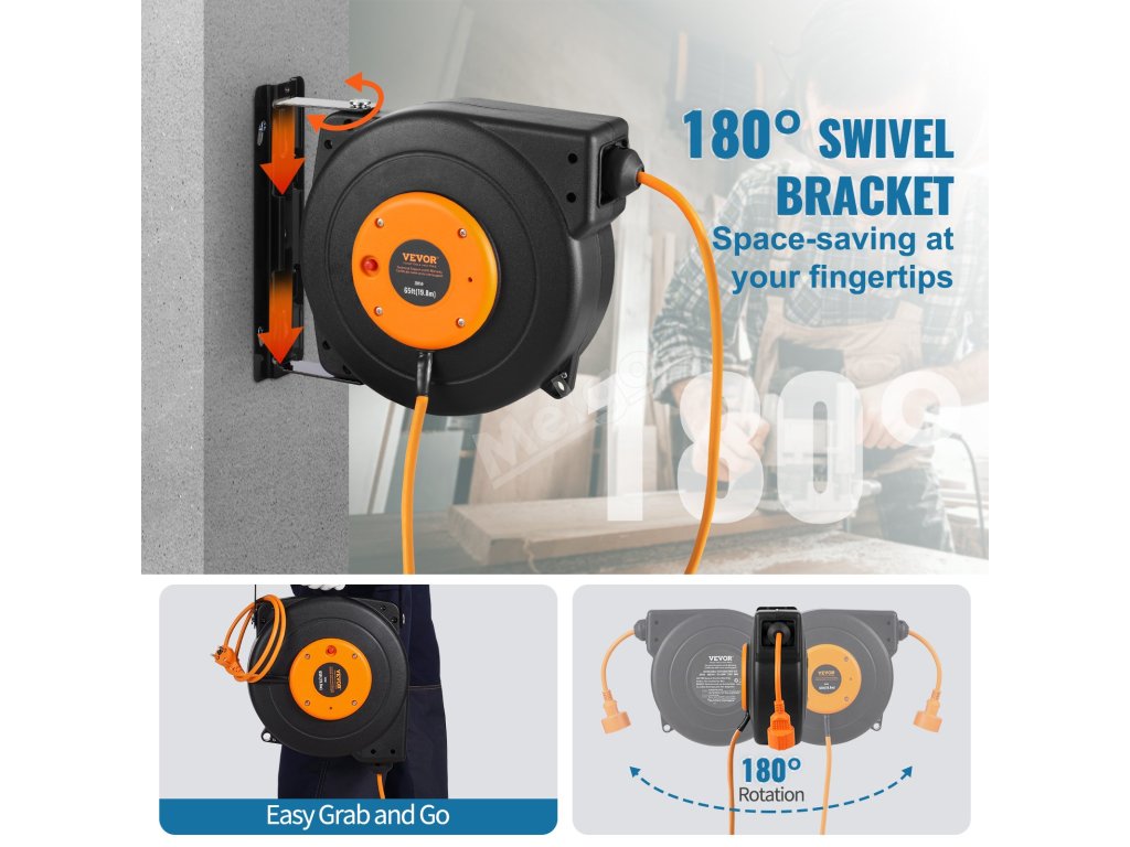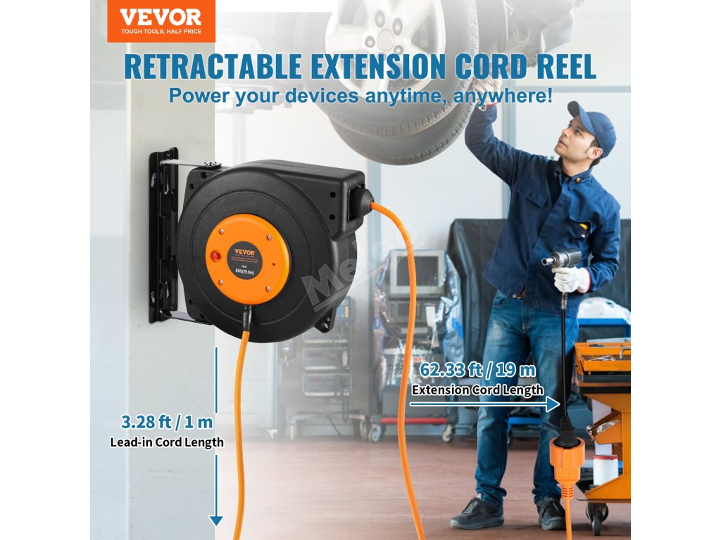 Náš naviják s prodlužovací šňůrou má 19m prodlužovací šňůru, 1m přívodní šňůru, automatický systém navíjení a vysokou nosnost 1500 W. Buďte v bezpečí díky certifikaci CE a ochraně proti přehřátí, která automaticky přeruší napájení při teplotě 56 °C. Napájejte svá zařízení kdekoli s VEVOR!