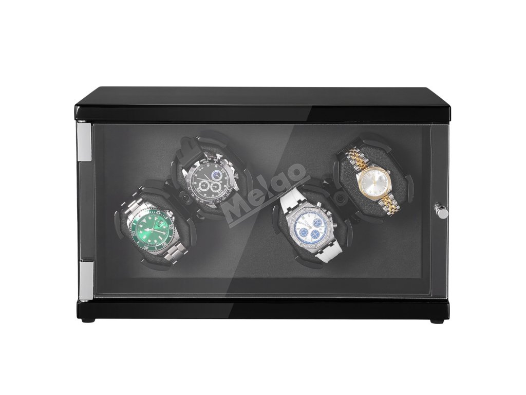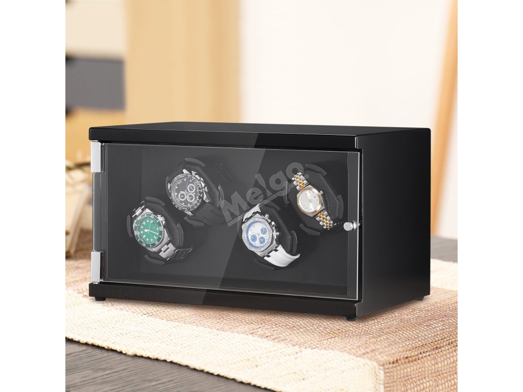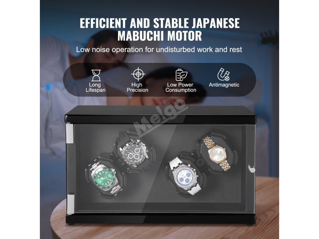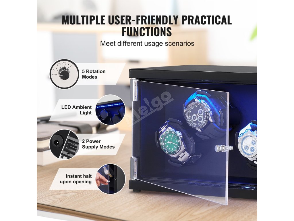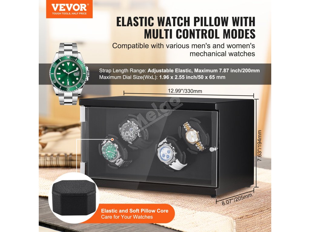 Náš natahovač hodinek je vybaven elastickými polštářky, které se přizpůsobí různým délkám řemínků. Funkce zastavení otevřeného víka zabraňuje bezcílnému chodu mechanismu a usnadňuje přístup. Modré ambientní LED světlo slouží jako elegantní dekorace displeje i jako noční osvětlení.