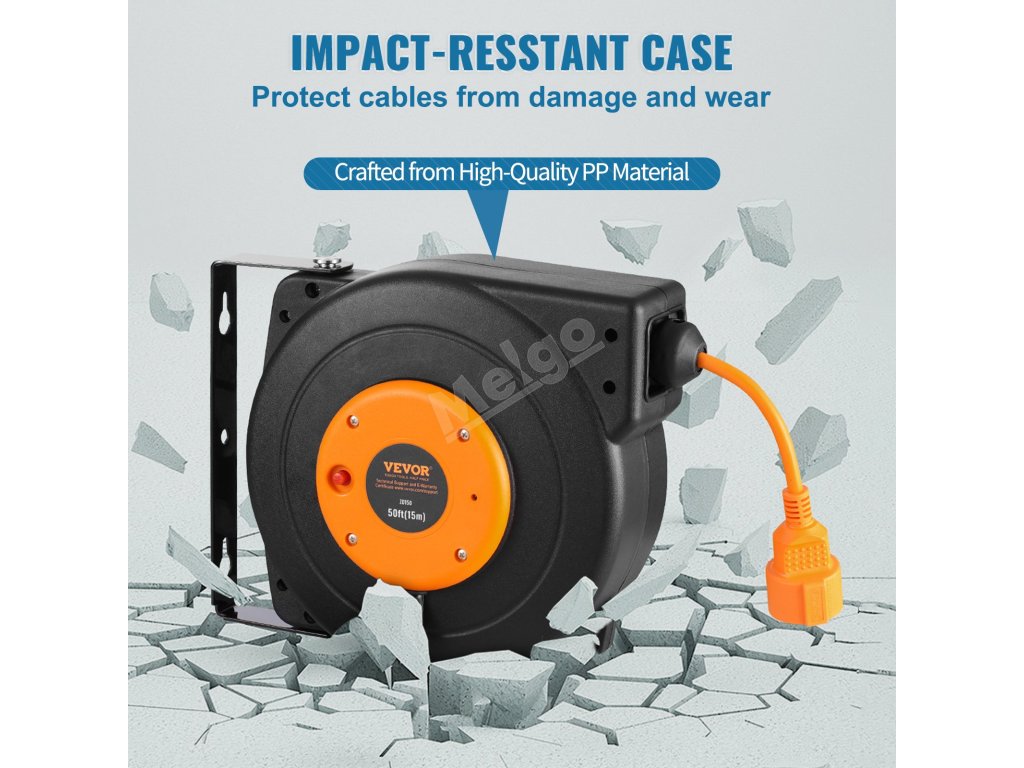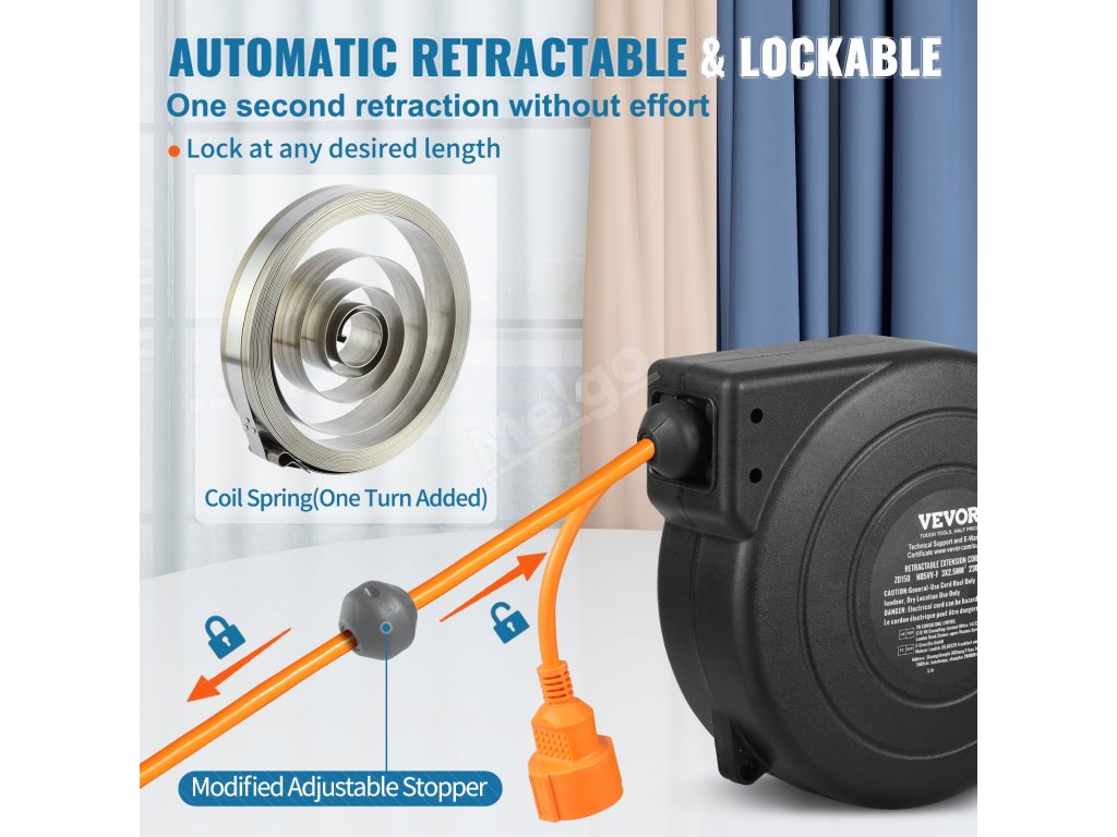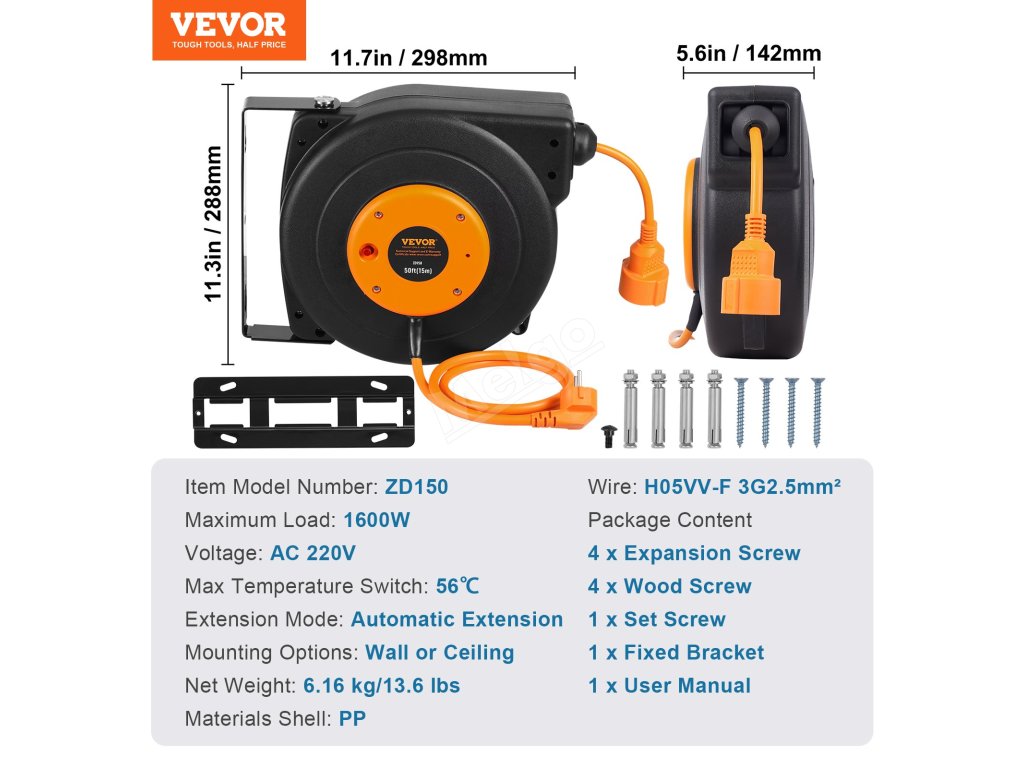 Náš naviják s prodlužovací šňůrou je vybaven 15m prodlužovací šňůrou, 1m přívodní šňůrou, automatickým navíjecím systémem a vysokým zatížením 1600 W. Buďte v bezpečí díky certifikaci CE a ochraně proti přehřátí, která automaticky přeruší napájení při teplotě 56 °C. Napájejte svá zařízení kdekoli s VEVOR!