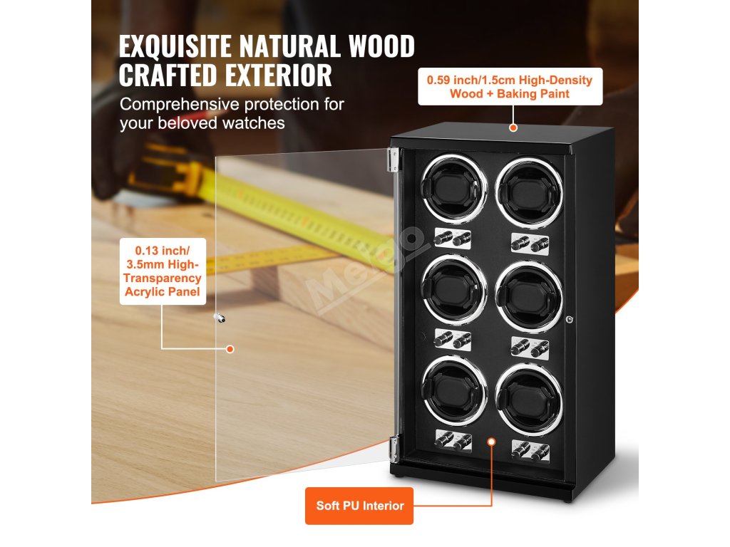 Naše otočné pouzdro na hodinky má zesílené pouzdro z masivního dřeva s lakovanou povrchovou úpravou a vysoce průhlednými akrylovými dvířky na sponu, což zvyšuje jeho strukturu a estetiku. Vnitřek z PU chrání hodinky před poškrábáním a zároveň se snadno čistí, takže natahovací pouzdro zůstane čisté.