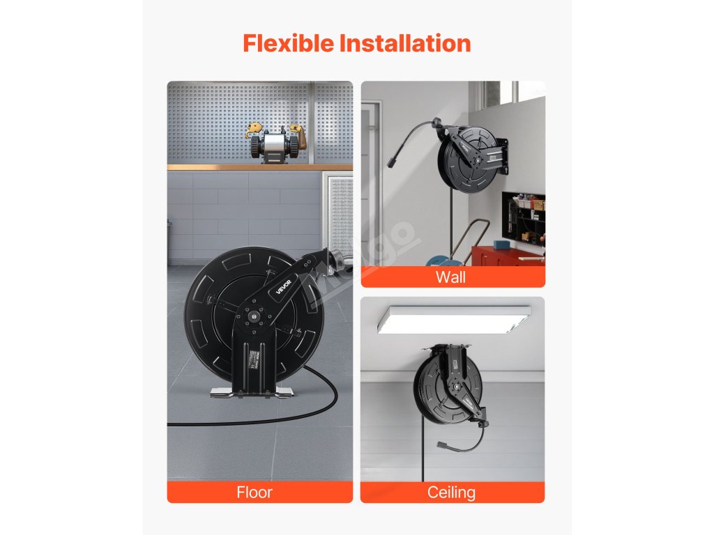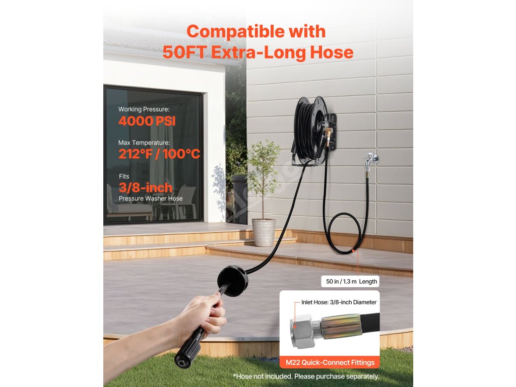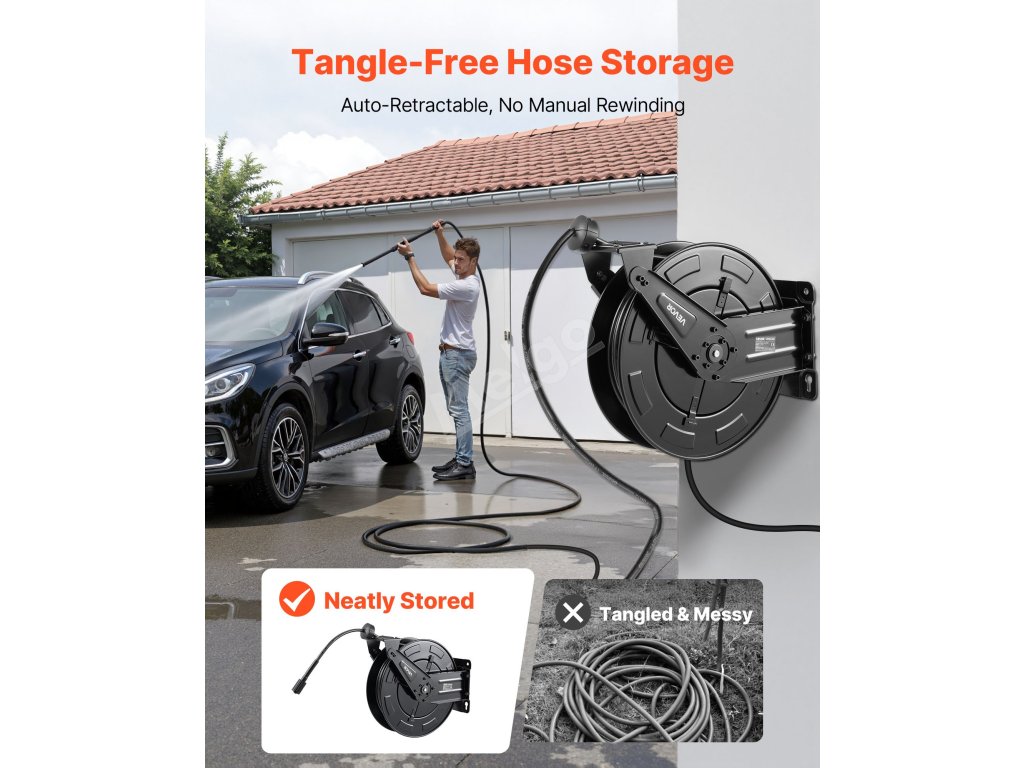 Tento naviják na hadice přehledně ukládá hadice a zabraňuje jejich zamotání. Ideální pro tlakové myčky, čištění automobilů, domácí použití a zalévání zahrady. Je všestranný a snadno se používá, zlepšuje účinnost čištění a zavlažování při různých každodenních úkonech.