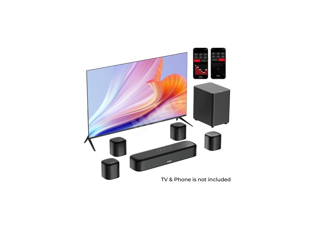 Soundbar Aura A60 pro televizor je vybaven 2 kabelovými předními prostorovými reproduktory a 2 kabelovými zadními prostorovými reproduktory, které jsou strategicky rozmístěny tak, aby poskytovaly rozsáhlé zvukové pole. Zadní reproduktory se k soundbaru připojují bezdrátově, což snižuje množství kabelů a zlepšuje využití prostoru.