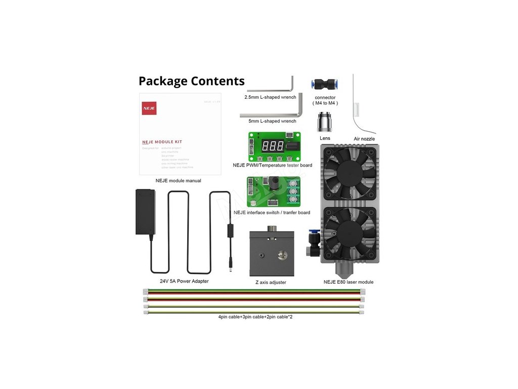 | Obsah balení | 1 x laserový modul 1 x nastavovač osy Z 1 x napájecí adaptér 24 V 5 A 1 x Rozhraní NEJE / Přenosová deska 1 x deska testeru NEJE PWM/Temperature 1 x klíč ve tvaru L 5 mm 1 x 2,5mm klíč ve tvaru L 1 x konektor M4 na M4 1 x vzduchová tryska 1 x objektiv 2 x 4pinový kabel + 3pinový kabel + 2pinový kabel 1 x uživatelská příručka |