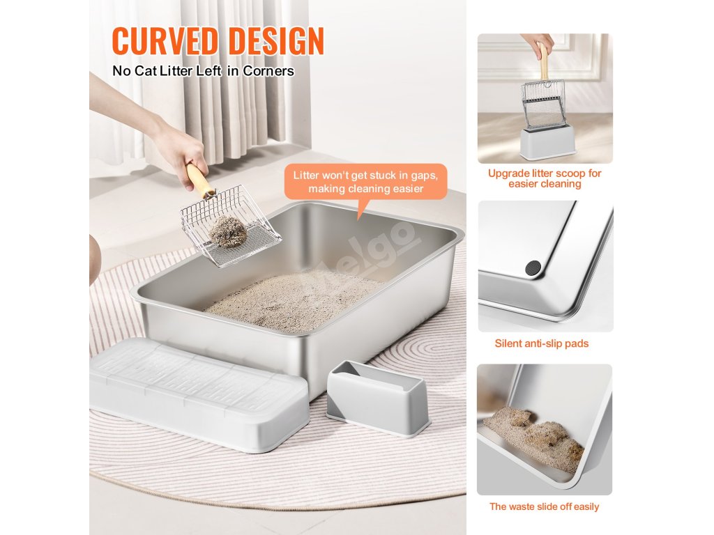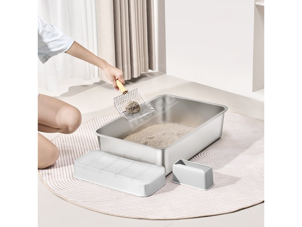 Tento box na kočičí stelivo je vyroben z nerezové oceli odolné proti opotřebení, kterou není snadné poškrábat a lze ji okamžitě umýt. Čtyři protiskluzové nožičky mezitím zajišťují, že je box na stelivo stabilní a nepohybuje se, čímž udržuje prostředí čisté a bez zápachu.