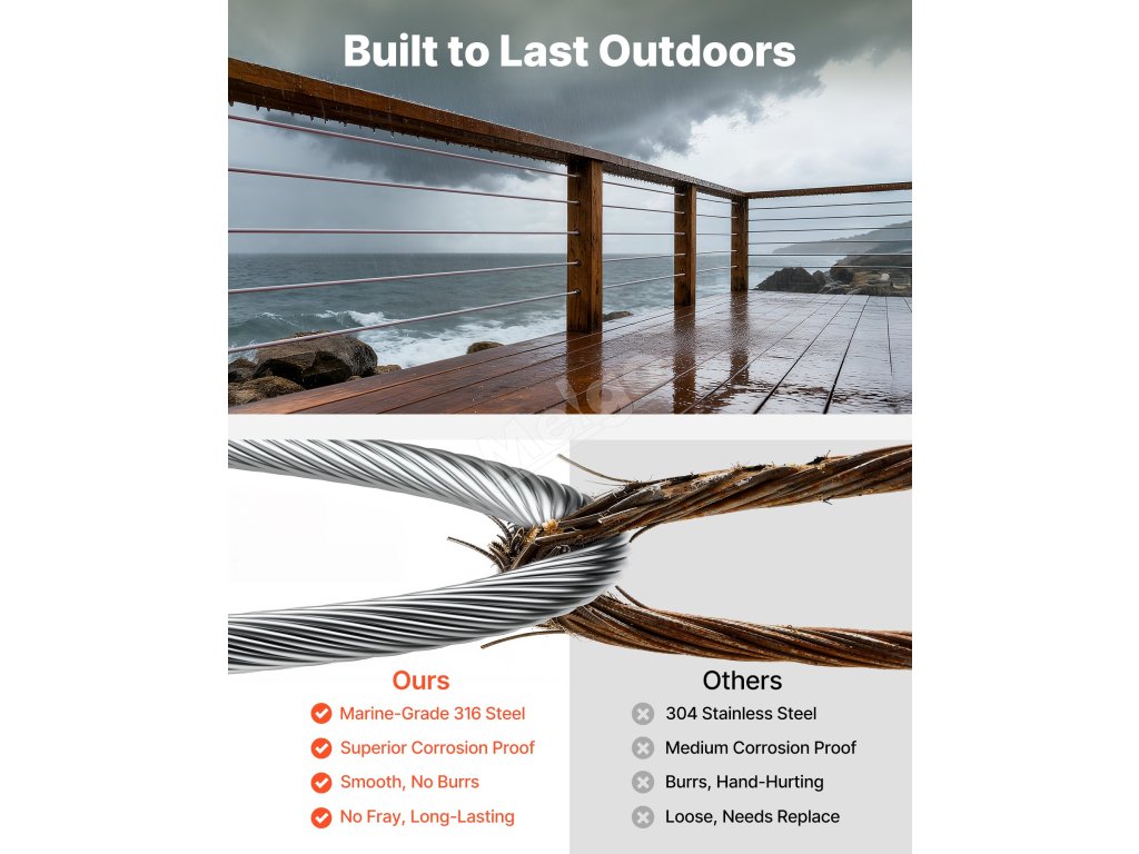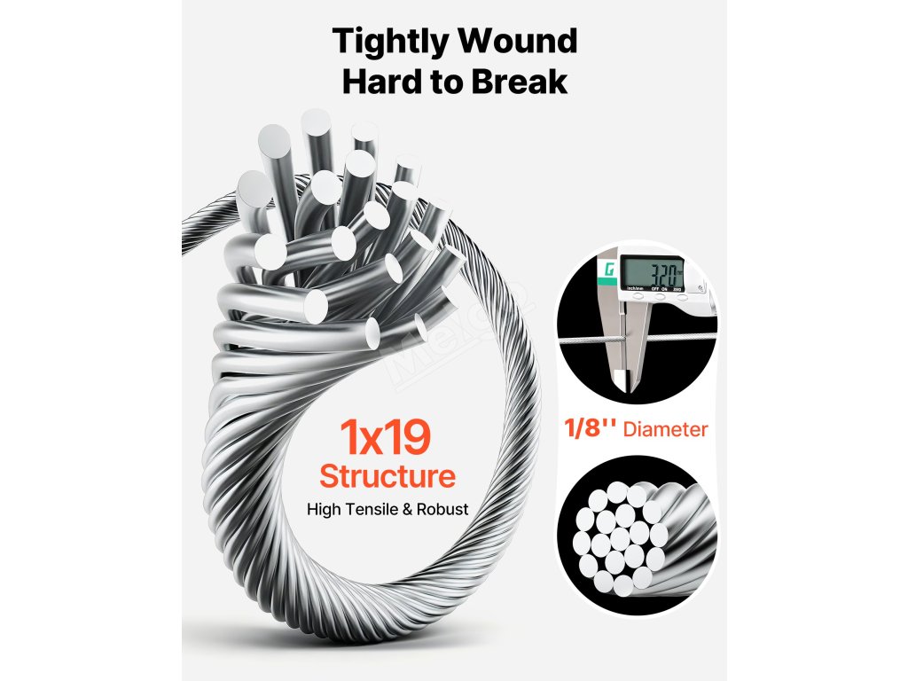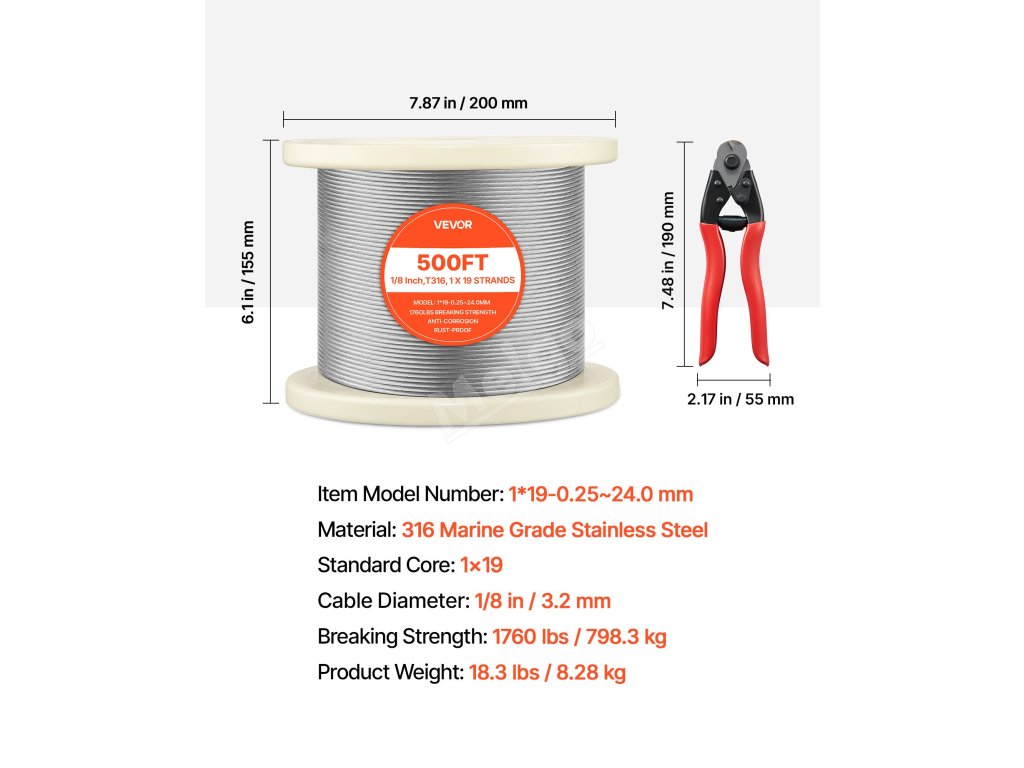 Tento drát z nerezové oceli 316 1x19 pro námořní použití kombinuje vysokou pevnost s odolností proti korozi. Lano o průměru 1/8 palce poskytuje pevnost v tahu až 1760 lb na cívce dlouhé 500 stop, takže je ideální pro zábradlí, ploty, mříže a osvětlení. Ergonomický nůž umožňuje čisté a přesné řezání.