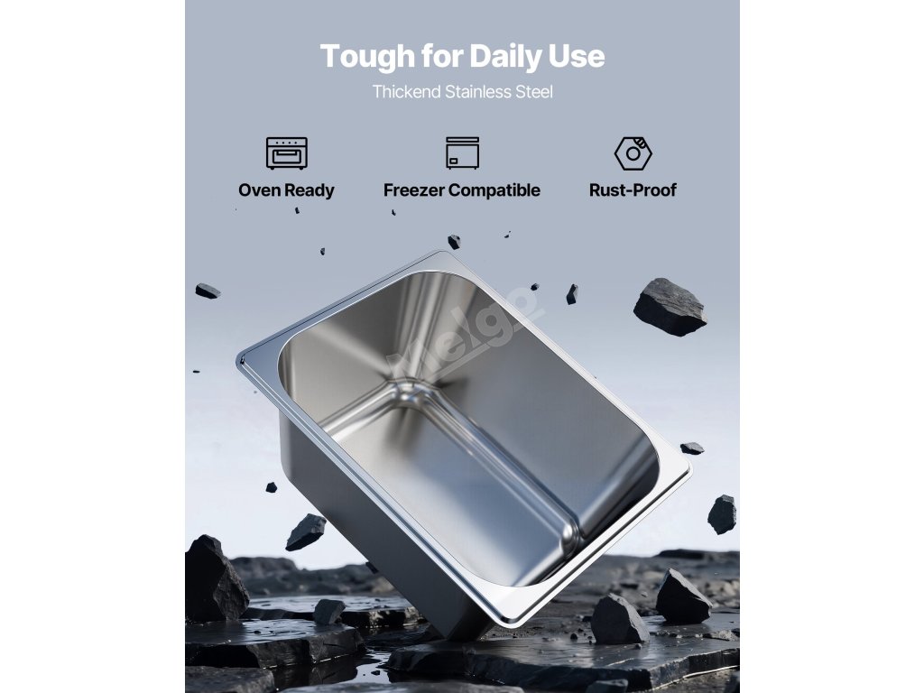Tato napařovací mísa je vyrobena z nerezové oceli SS201 o tloušťce 22 mm, která je pevná a odolná proti korozi. Dvoudílná miska o velikosti 1/2, hloubce 6 palců a s víkem vyhovuje každodenním potřebám vaření a je ideální pro vaření, skladování a vystavování potravin, jako je maso, zelenina, ovoce a dokonce i zmrzlina.