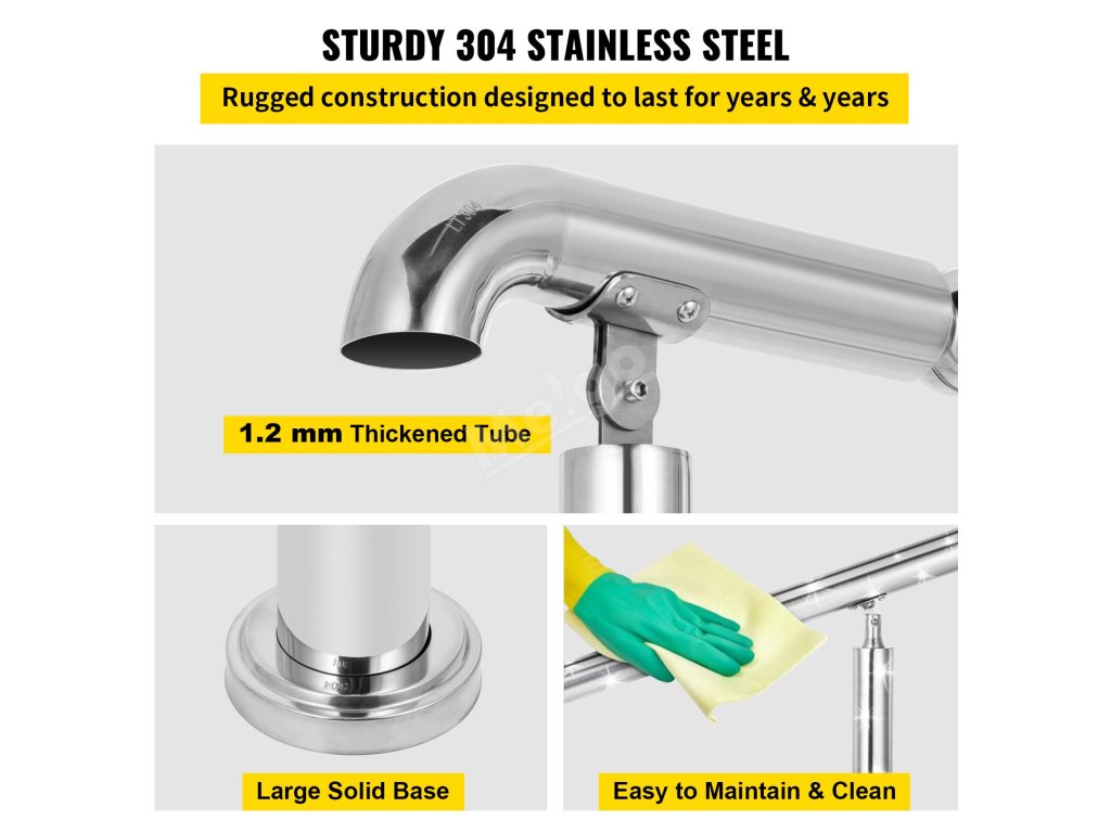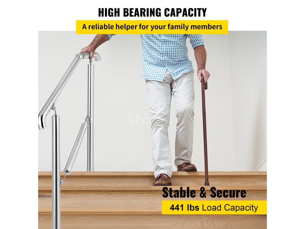Naše schodišťové zábradlí unese zatížení až 441 lbs/200 kg. Trubka je silná 0,05 mm, takže se snadno nedeformuje ani neohýbá. Také 0,12"/3 mm silná základna poskytuje výjimečnou stabilitu a pevnou oporu.