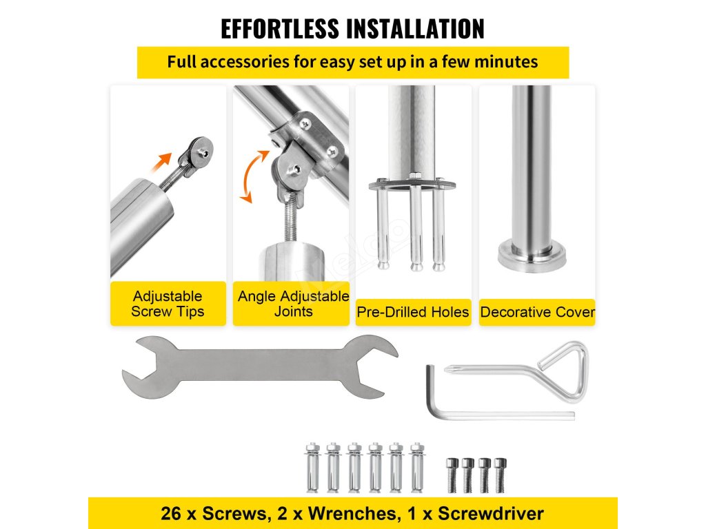 Díky flexibilnímu šroubovému spojení je toto vnější zábradlí úhlově nastavitelné v rozmezí 0-45°, aby vyhovovalo schodům různých výšek. Můžete si tak nastavit požadovanou polohu tak, aby vyhovovala vašim různým potřebám.