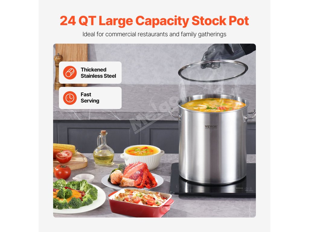 V hrnci na omáčku o objemu 24 qT lze vařit značné množství surovin najednou, takže je vhodný pro komerční použití v kuchyni i pro rodinné oslavy! Ideální pro dušení, přípravu polévek, vaření v páře a smažení!