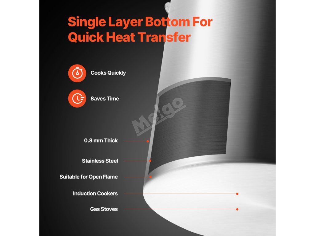 Jednovrstvé dno o tloušťce 0,8 mm umožňuje rychlé zvýšení teploty uvnitř hrnce, takže se jídlo rychle uvaří!
