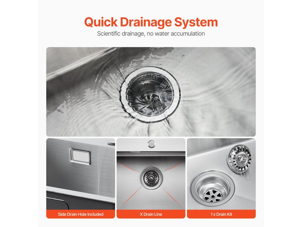 Přípravný kuchyňský dřez má ve spodní části odtok ve tvaru písmene X a je vybaven odtokovou soupravou, která zajišťuje rychlý odtok vody a zabraňuje jejímu hromadění. Kromě toho obsahuje boční odtok se 2 rozhraními vodovodního potrubí pro připojení myčky, což zajišťuje plynulý odtok vody.