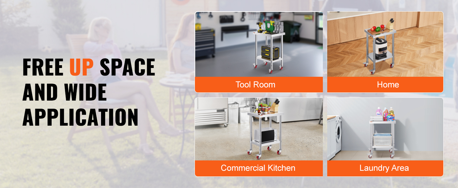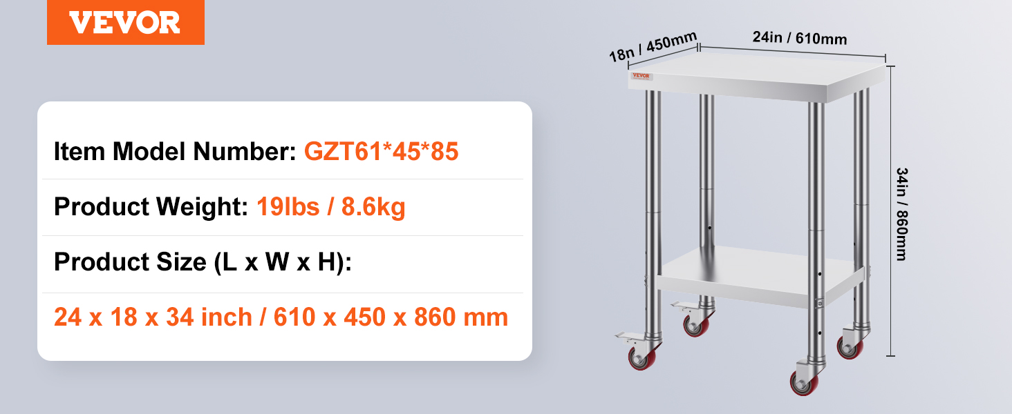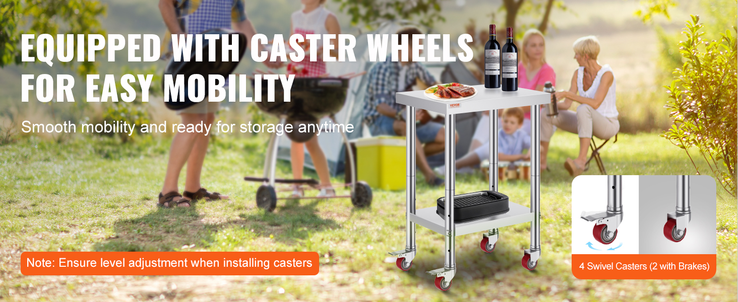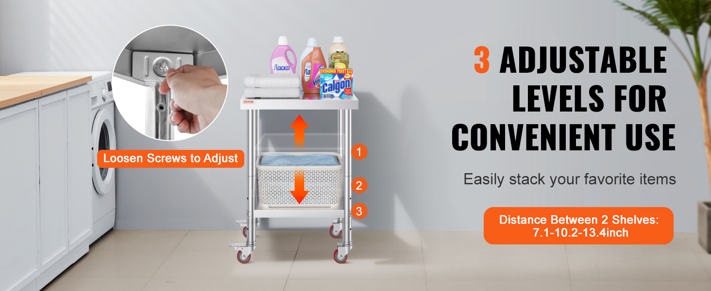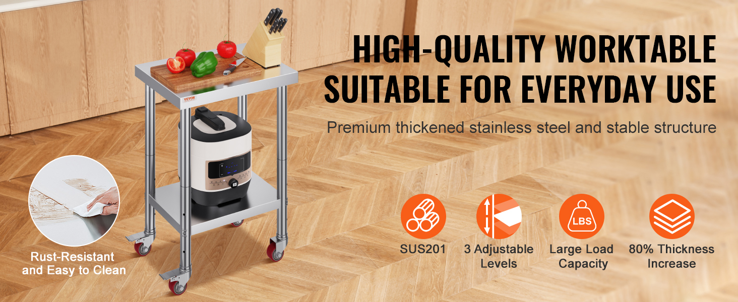 Nerezový pracovní stůl 24×18×34 inch, 700 lbs, 4 kolečka, 3 výšky