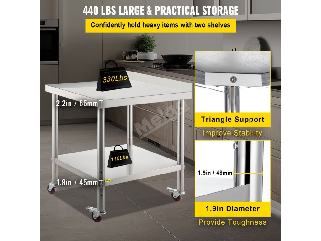 Tento prípravný stôl má spodnú policu. Spodnú policu môžete nastaviť do troch rôznych výšok. Tento nastaviteľný pracovný stôl s spodnou policou vám umožňuje prispôsobiť úložný priestor tak, aby vyhovoval rôznym predmetom. Policu môžete zdvihnúť alebo spustiť v 3-palcových intervaloch, čo vám umožňuje flexibilitu pri organizovaní vašich zásob. Horná polica unesie až 330 libier a spodná polica 110 libier. Je teda vhodná na bezpečné skladovanie ťažkých predmetov. Ďalšou výhodou nášho stola je jeho neuveriteľne univerzálny dizajn. Preto je ideálnym doplnkom do každej kuchyne alebo pracovného priestoru.