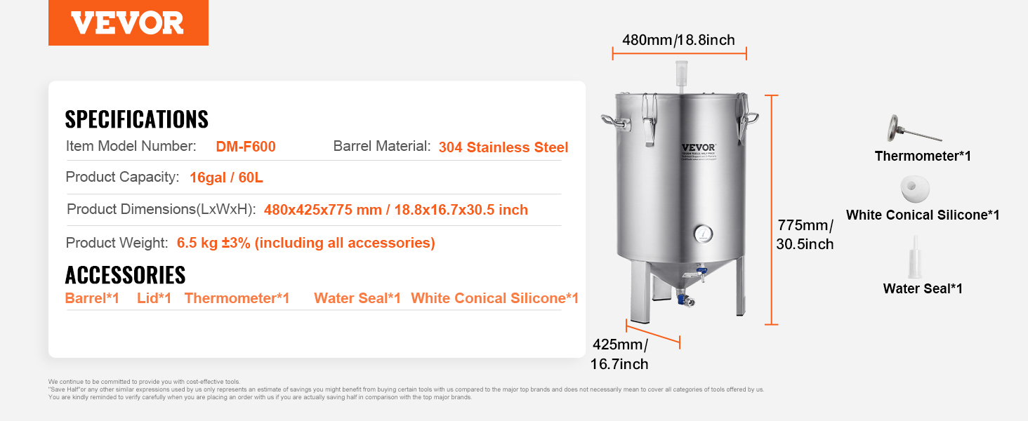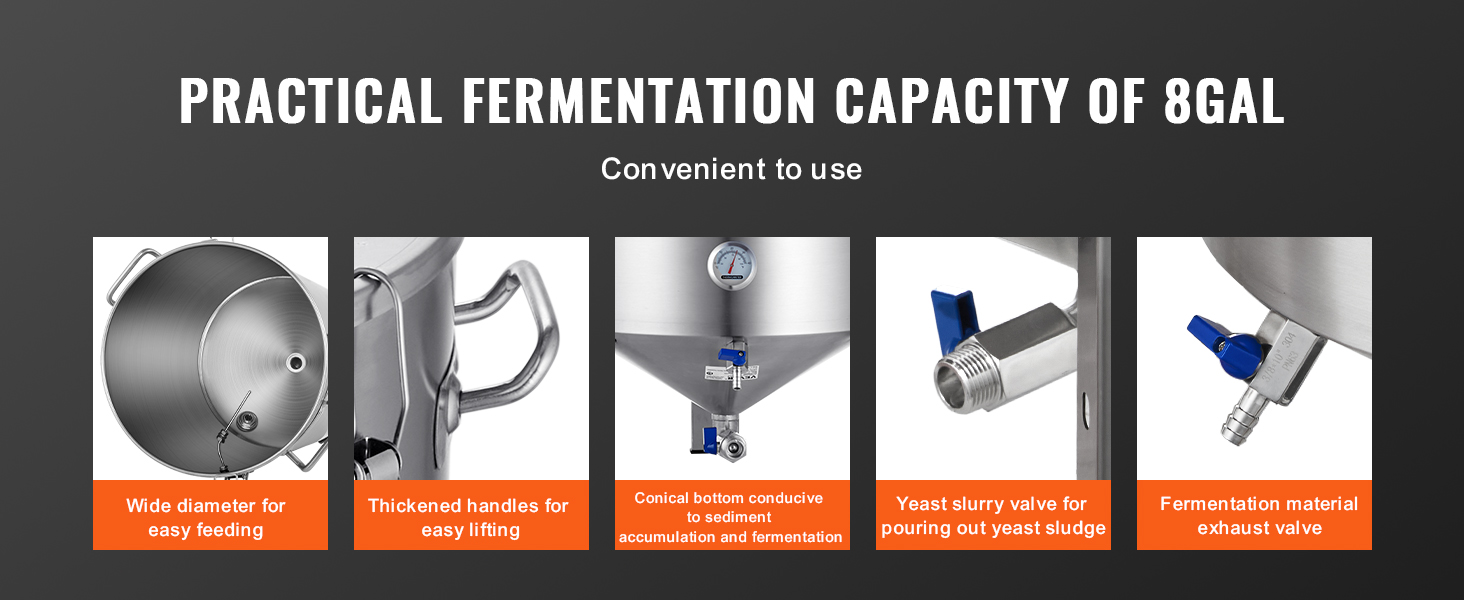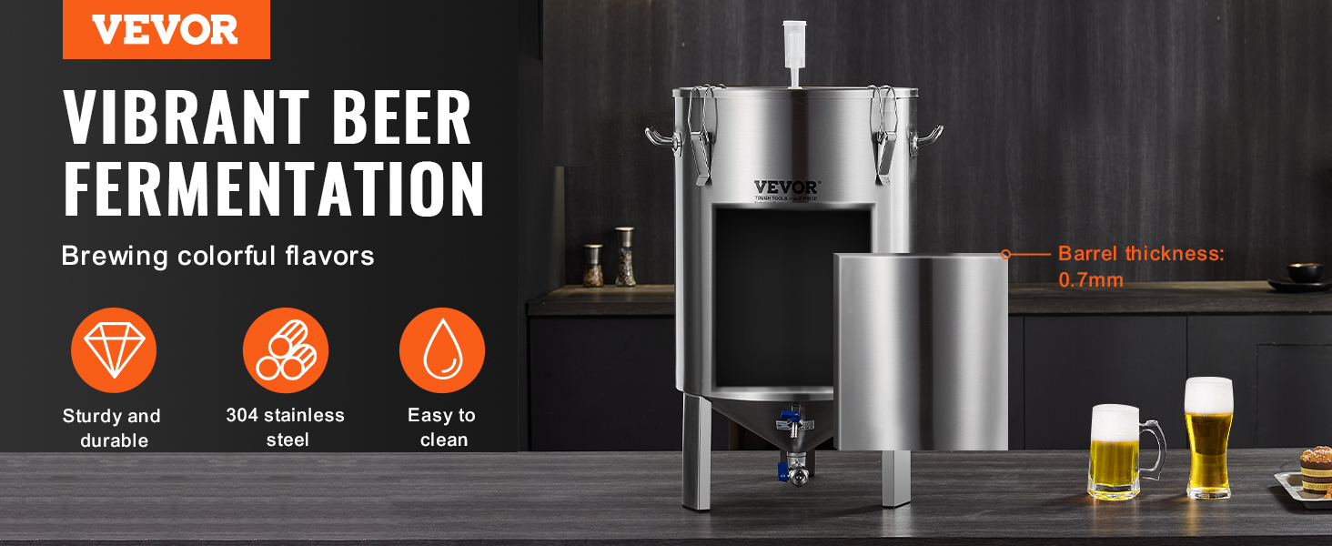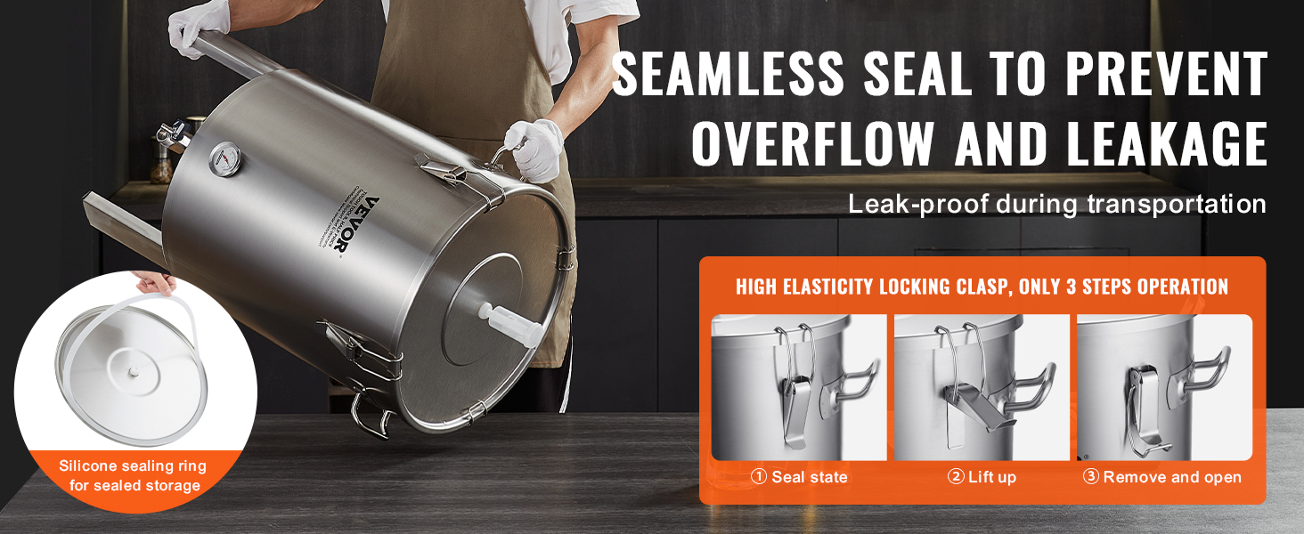 Fermentor na vaření piva používá modernizované uzavřené uzamykací svorky s vysokou flexibilitou. Víko sudu je vybaveno silikonovým těsnicím kroužkem, který bezpečně uzamkne víko k tělu sudu, čímž zabraňuje únikům, zajišťuje delší udržení fermentace a nebojí se nárazů při přepravě.