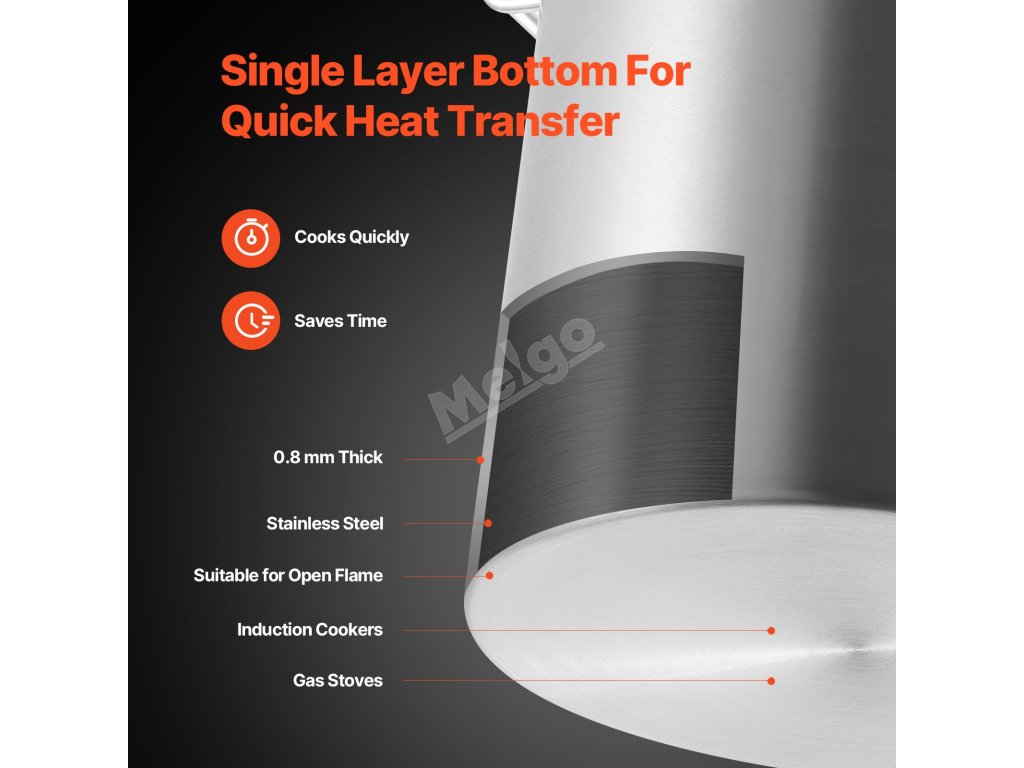 Jednovrstvé dno o tloušťce 0,8 mm umožňuje rychlé zvýšení teploty uvnitř hrnce, takže se jídlo rychle uvaří!