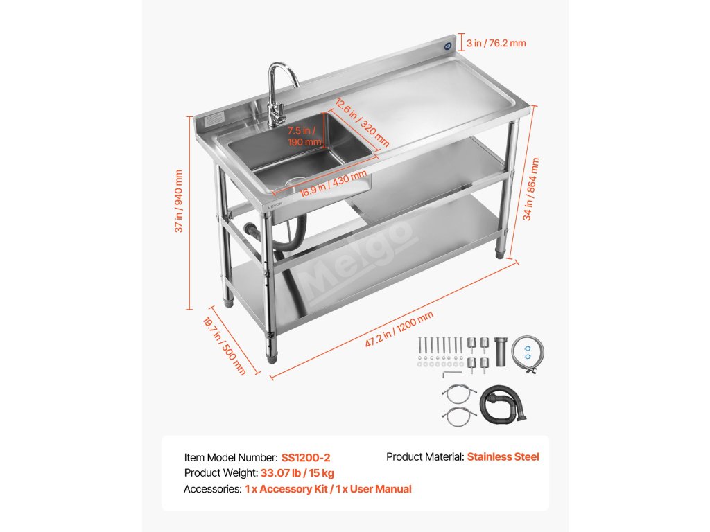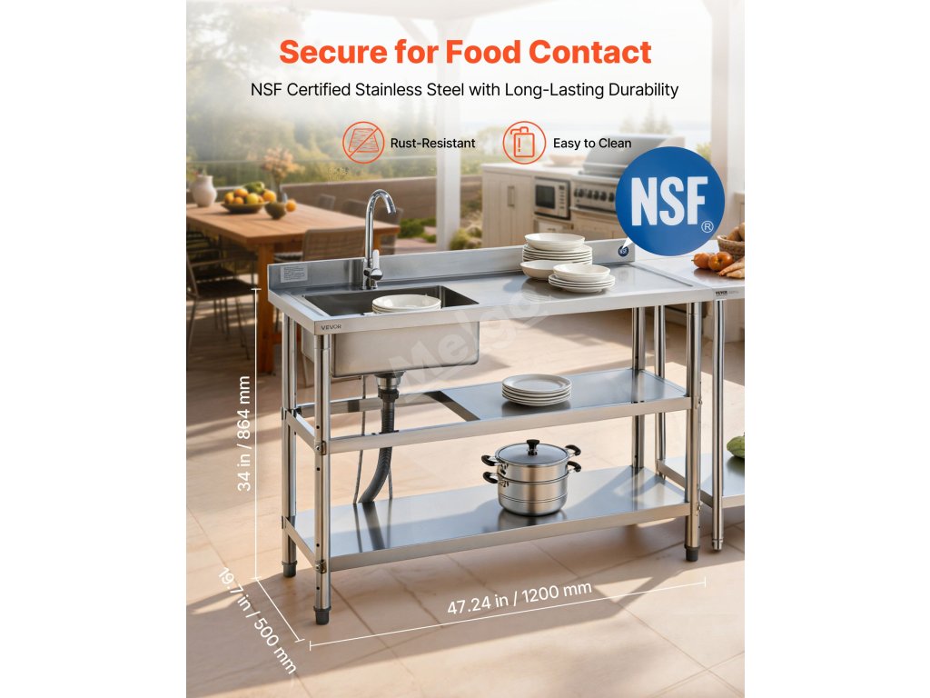 Nerezový volně stojící jednokomorový dřez s baterií 1200×500×940 mm