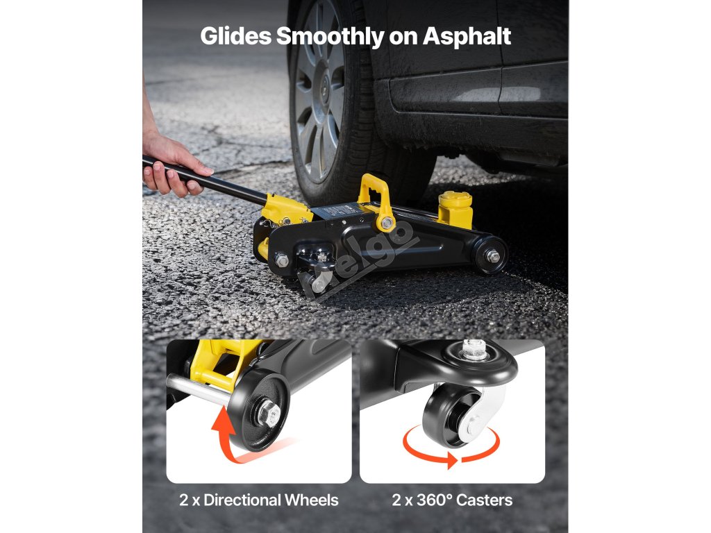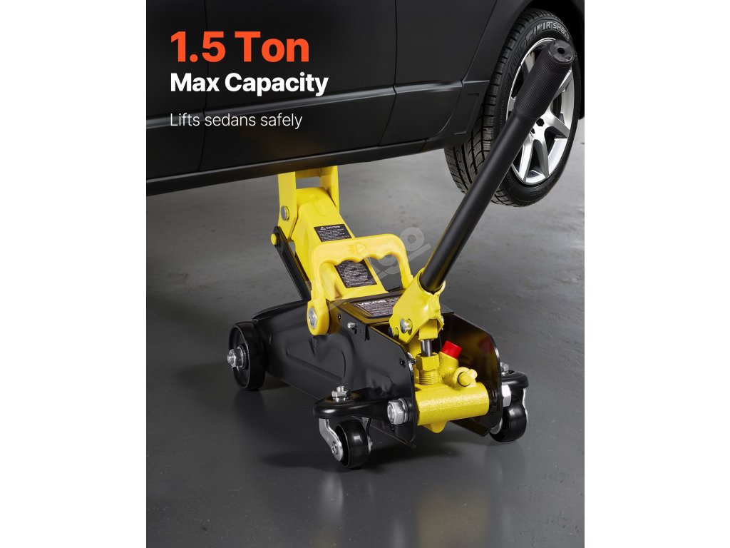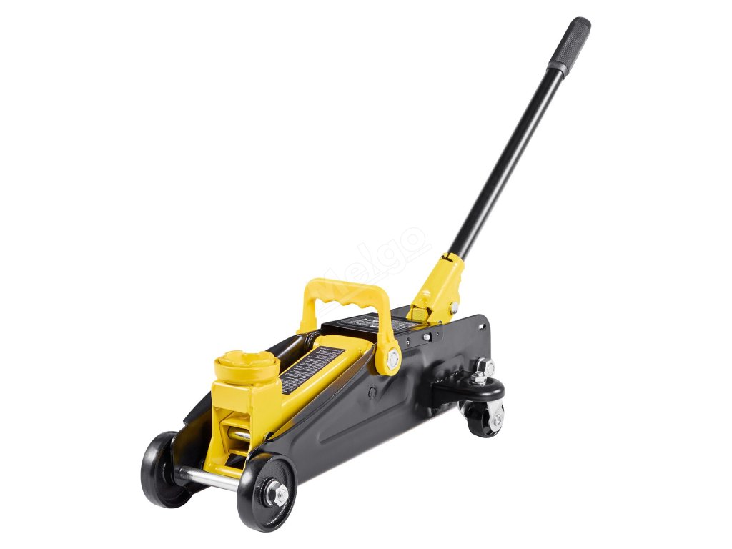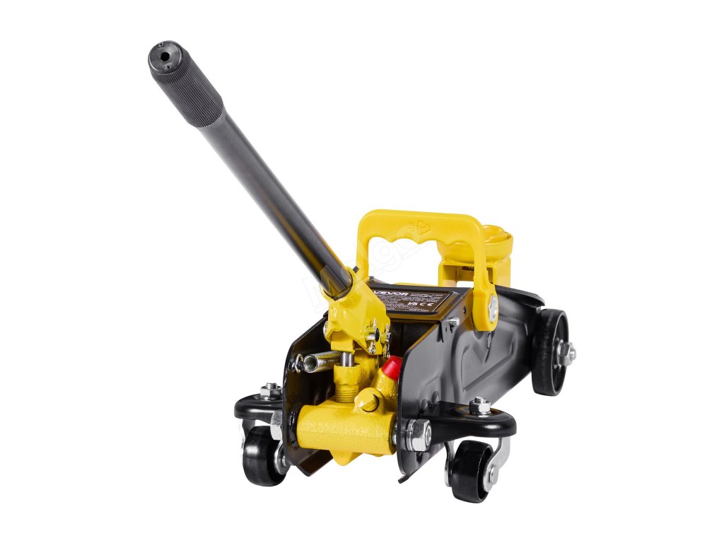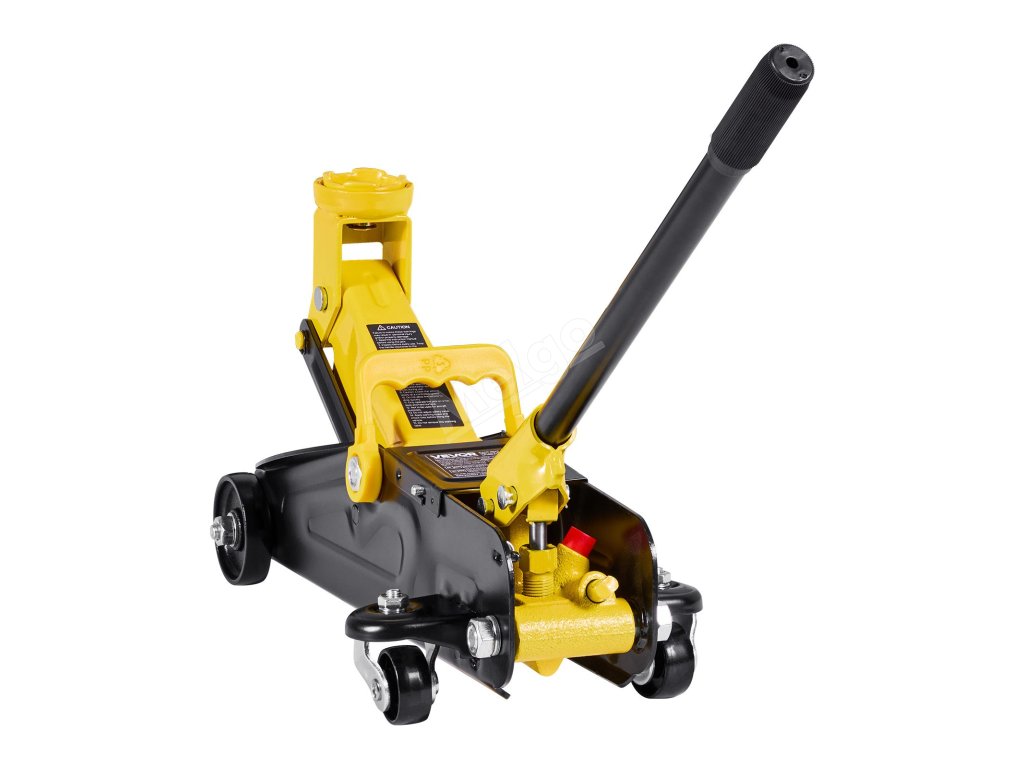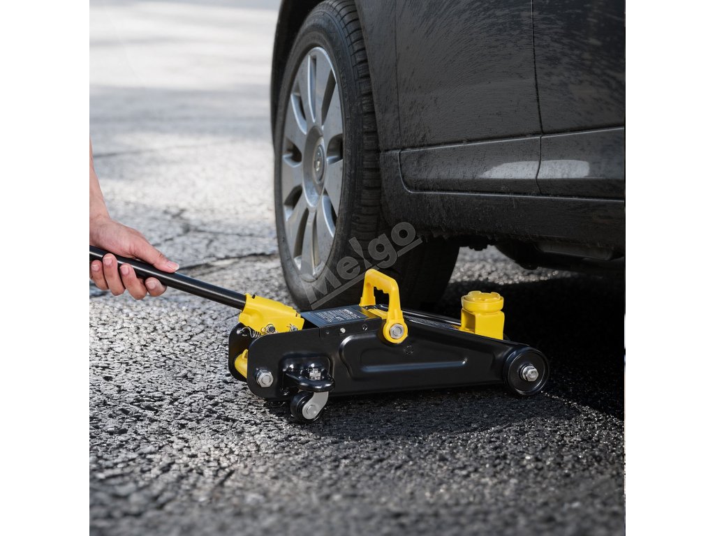 Tento nízkoprofilový podlahový zvedák vybavený rukojetí lze snadno přemístit pod vozidlo a pumpování je snadné.