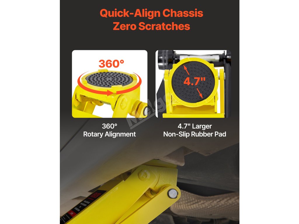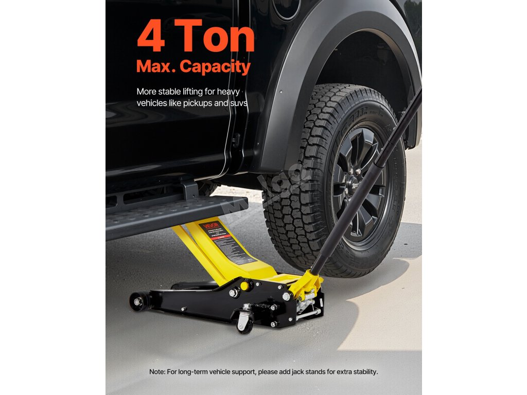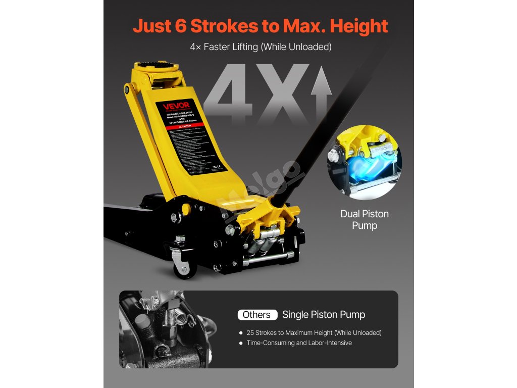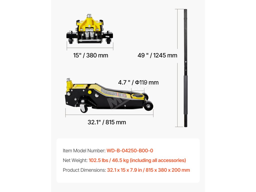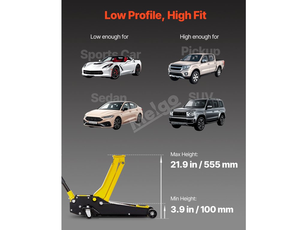 Tento železný podlahový zvedák s vysokým zdvihem poskytuje silný zdvih pro snadné zvedání sedanů, SUV a pickupů. Jeho prodloužená výška zdvihu umožňuje pohodlnější údržbu pickupů, výměnu pneumatik a čištění. Poznámka: Při dlouhodobých opravách vždy používejte stojan na zvedák.