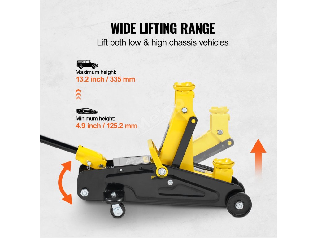 Díky minimální výšce 4,9 palce se tento nízkoprofilový podlahový zvedák snadno vejde pod různá vozidla a zvedne je do typické výšky potřebné pro opravy. Snadné a bezpečné ovládání. Před nákupem změřte výšku svého podvozku.