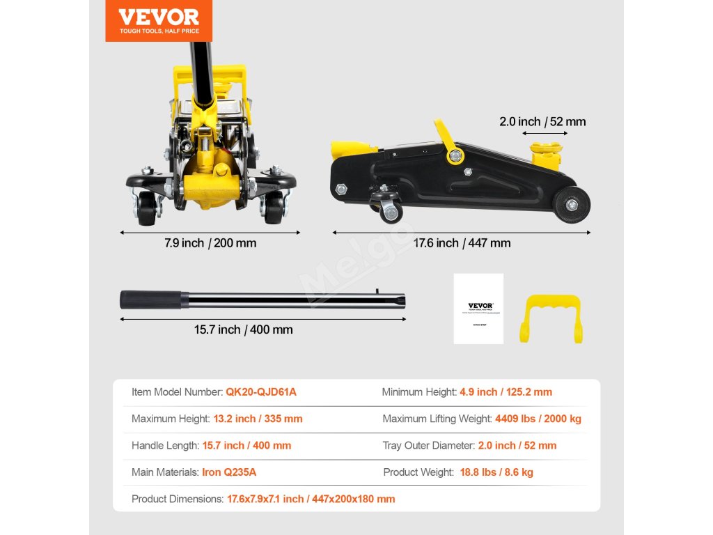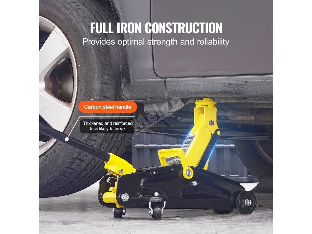 Tento podlahový zvedák je vyroben z vysoce pevných železných materiálů, takže je spolehlivým a robustním nástrojem pro pravidelnou údržbu a opravy automobilů.