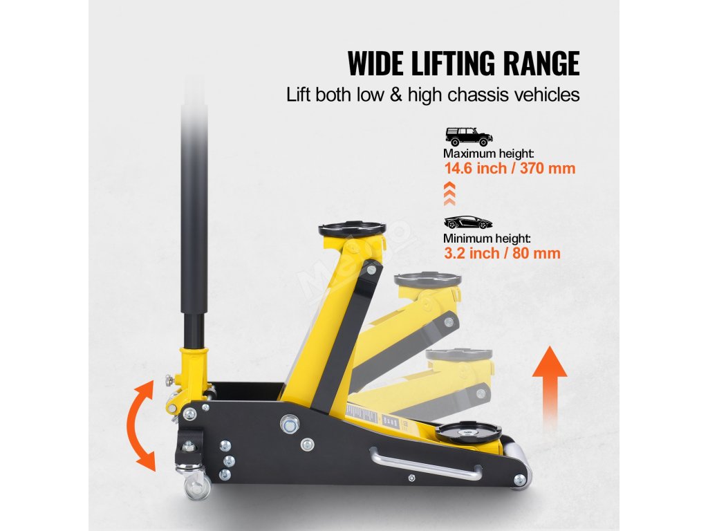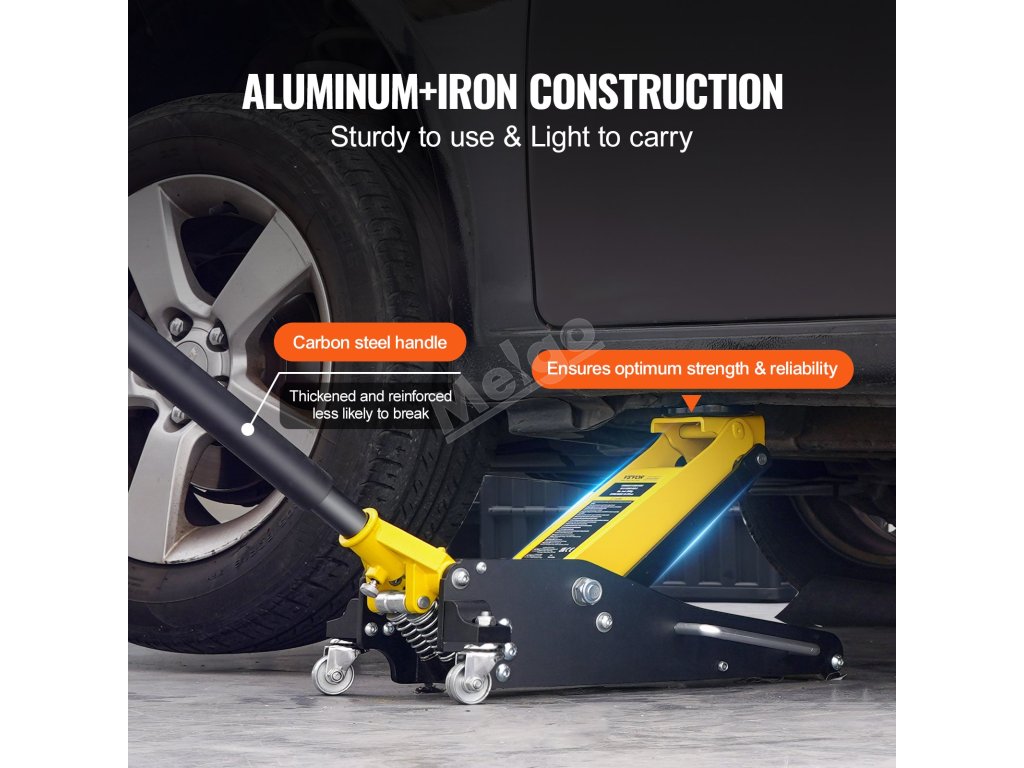 Je vyroben z vysoce pevných materiálů z hliníku a železa, takže podlahový zvedák je spolehlivým a robustním nástrojem pro pravidelnou údržbu a opravy automobilů. Tento materiál je lehčí a přenosnější než železo.