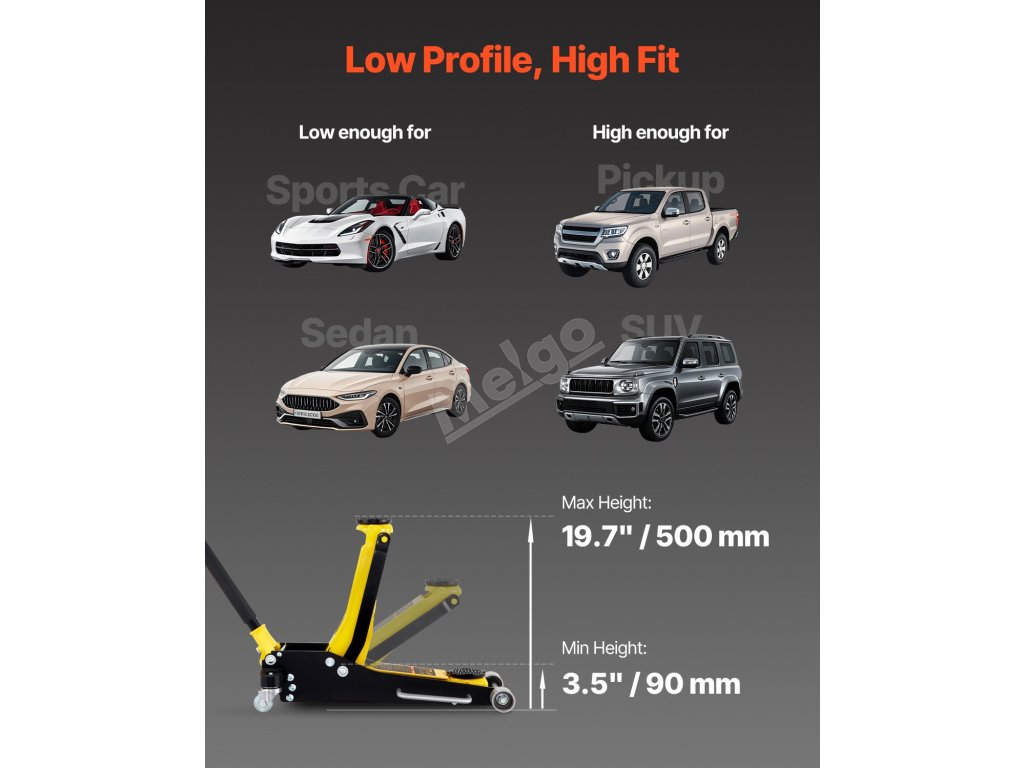 Široký rozsah zdvíhania je navrhnutý tak, aby vyhovoval rôznym potrebám. Tento ťažký závodný zdvihák má minimálnu výšku 3-6/11 palcov a maximálnu výšku 19-11/16 palcov. Dokáže zdvihnúť od 3-5/11 palcov, vďaka čomu je vhodný pre rôzne vozidlá, od nízkoprofilových športových vozidiel až po nákladné vozidlá s vysokou svetlou výškou. Naša nízkoprofilová konštrukcia mu umožňuje zasunúť sa pod vozidlá s minimálnou svetlou výškou. Táto všestrannosť je výhodná najmä pre tých, ktorí vlastnia viacero typov vozidiel. Všetky úlohy zdvíhania môžete vykonať naraz bez toho, aby ste potrebovali viacero zdvihákov. Široký sortiment vám umožňuje vykonávať úlohy jednoducho a hospodárne.