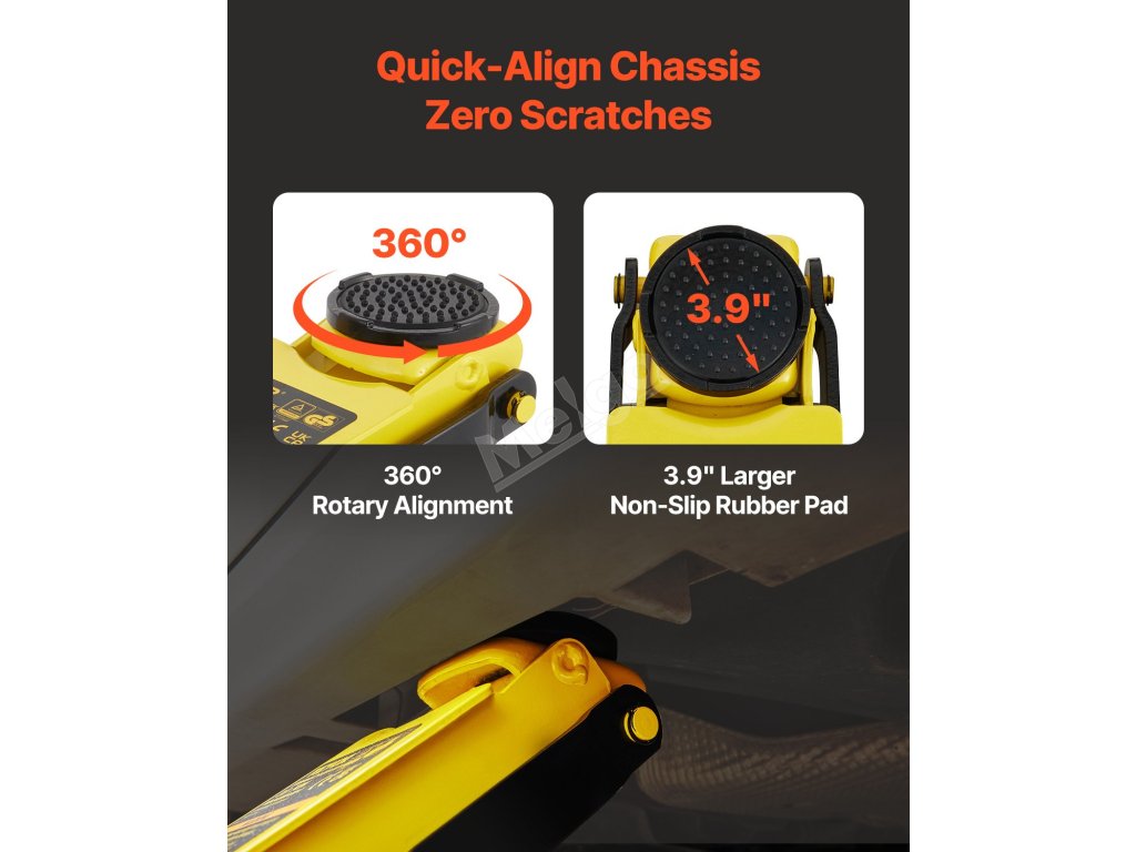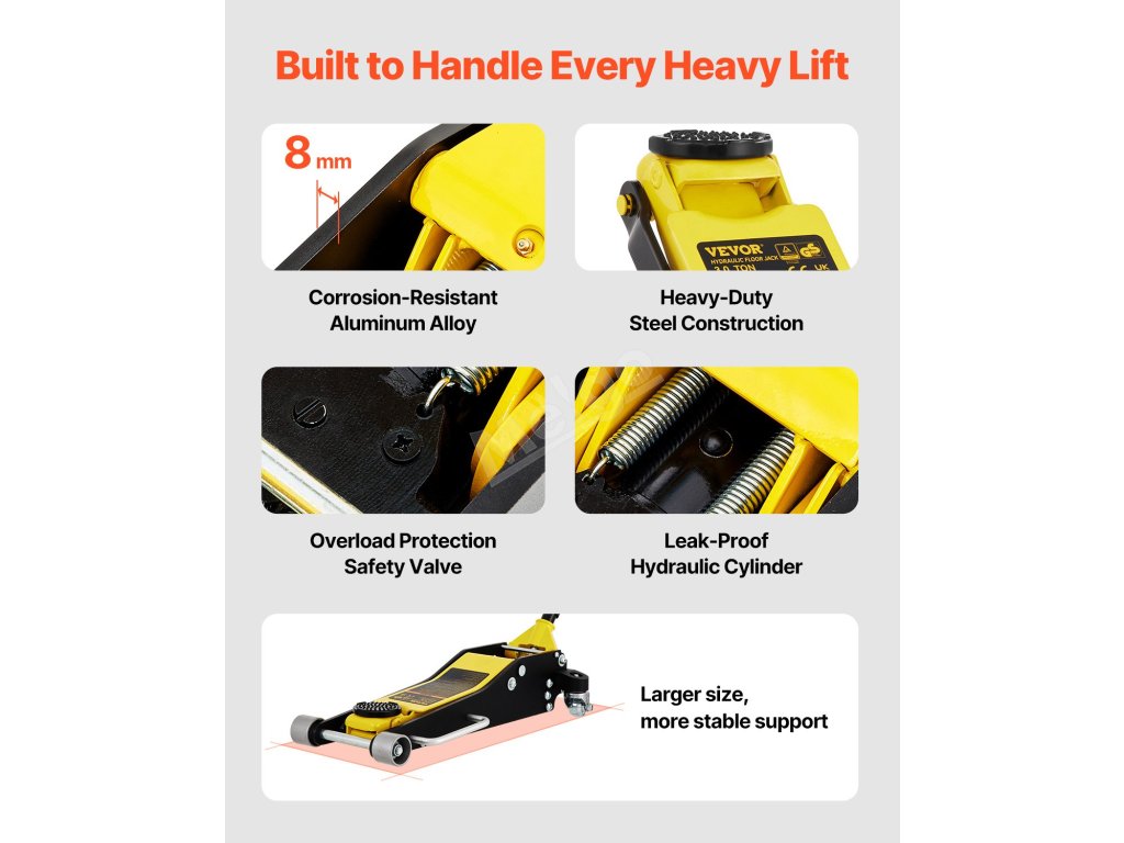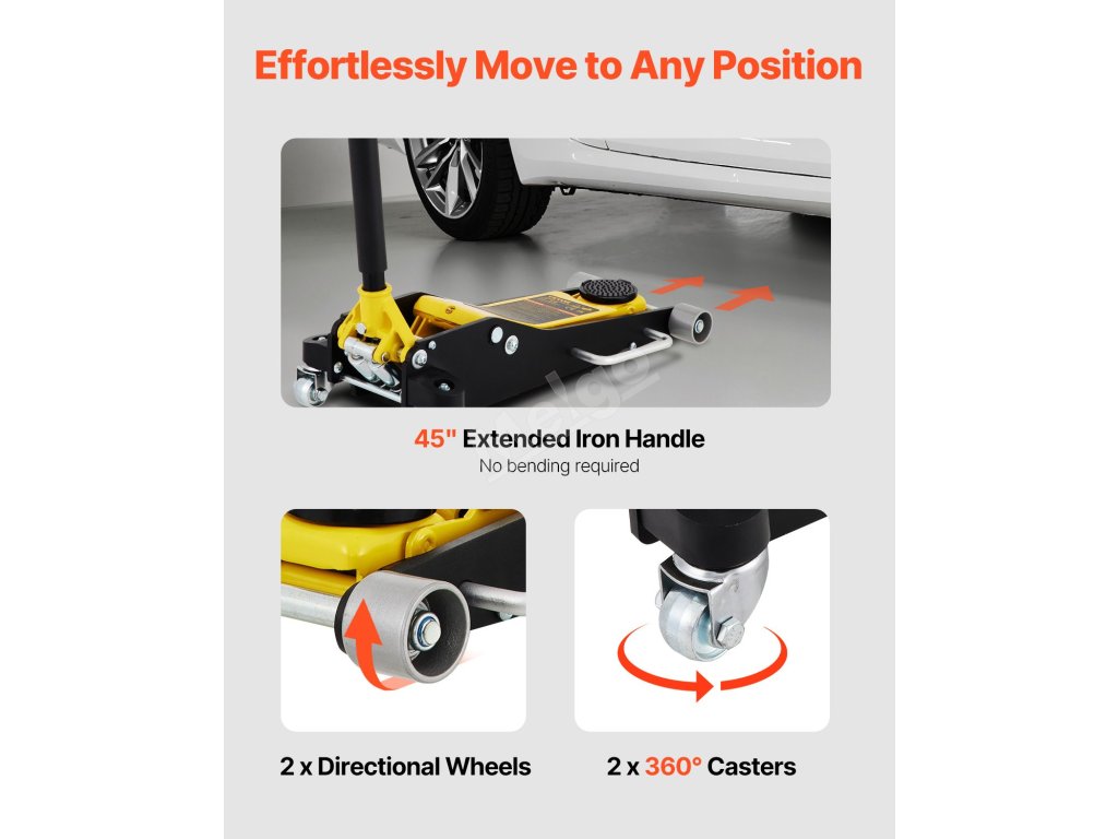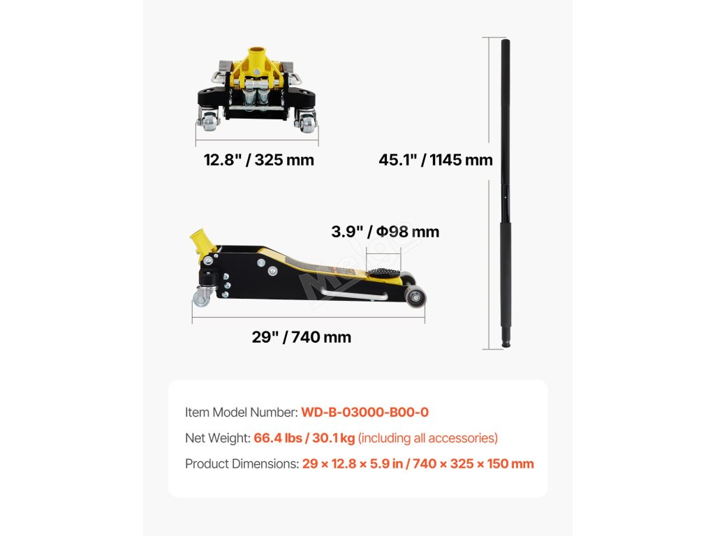 Je ľahko zmontovateľný a ovládateľný, s jasnými pokynmi, vďaka čomu je nastavenie rýchle a jednoduché. Používanie uľahčujú kolieska a bočné rukoväte, vďaka ktorým sa hladko pohybuje po rôznych povrchoch. Bočné rukoväte poskytujú pohodlné možnosti prenášania. Tento 3tonový nízkoprofilový podlahový zdvihák je určený pre začiatočníkov aj skúsených používateľov. Plynulá prevádzka zabezpečuje zdvíhanie bez námahy, čím sa znižuje námaha. Intuitívny dizajn uľahčuje jeho používanie aj pri zložitých úlohách. Tento zdvihák je používateľsky prívetivým nástrojom, ktorý vám zlepší prácu v garáži.