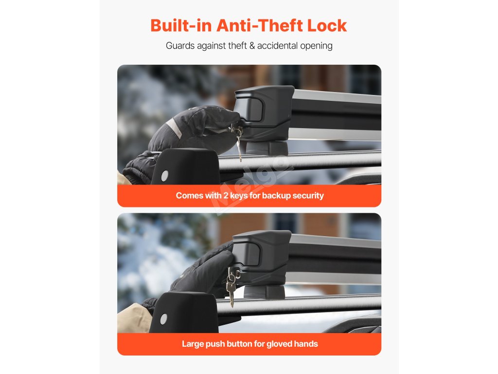 Náš nosič lyží je vybaven zámkem proti krádeži, který lze snadno zamknout nebo uvolnit i v rukavicích. Tato chytrá konstrukce umožňuje rychlé a efektivní ovládání během venkovních výletů, aniž byste si museli sundávat rukavice.