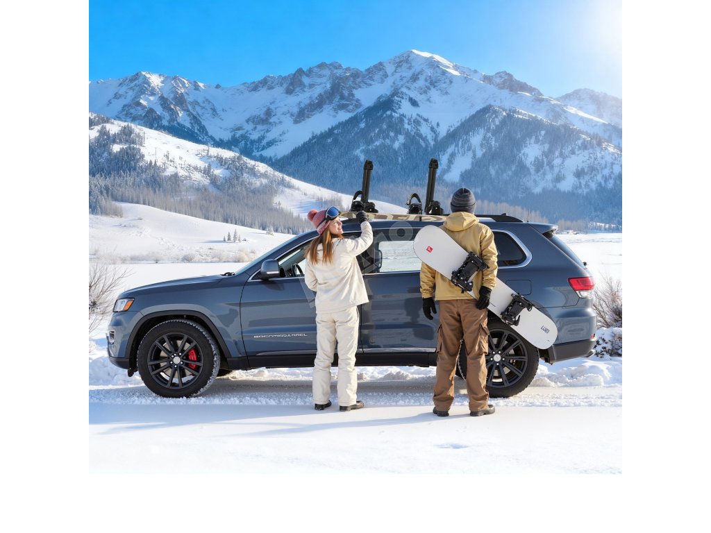 Střešní nosič lyží využívá gumové polstrování pro uložení lyžařské výbavy celé rodiny, čímž maximalizuje prostor na střeše, aniž by zabíral místo v kufru. Zajišťuje efektivní skladování a přepravu veškerého outdoorového vybavení.