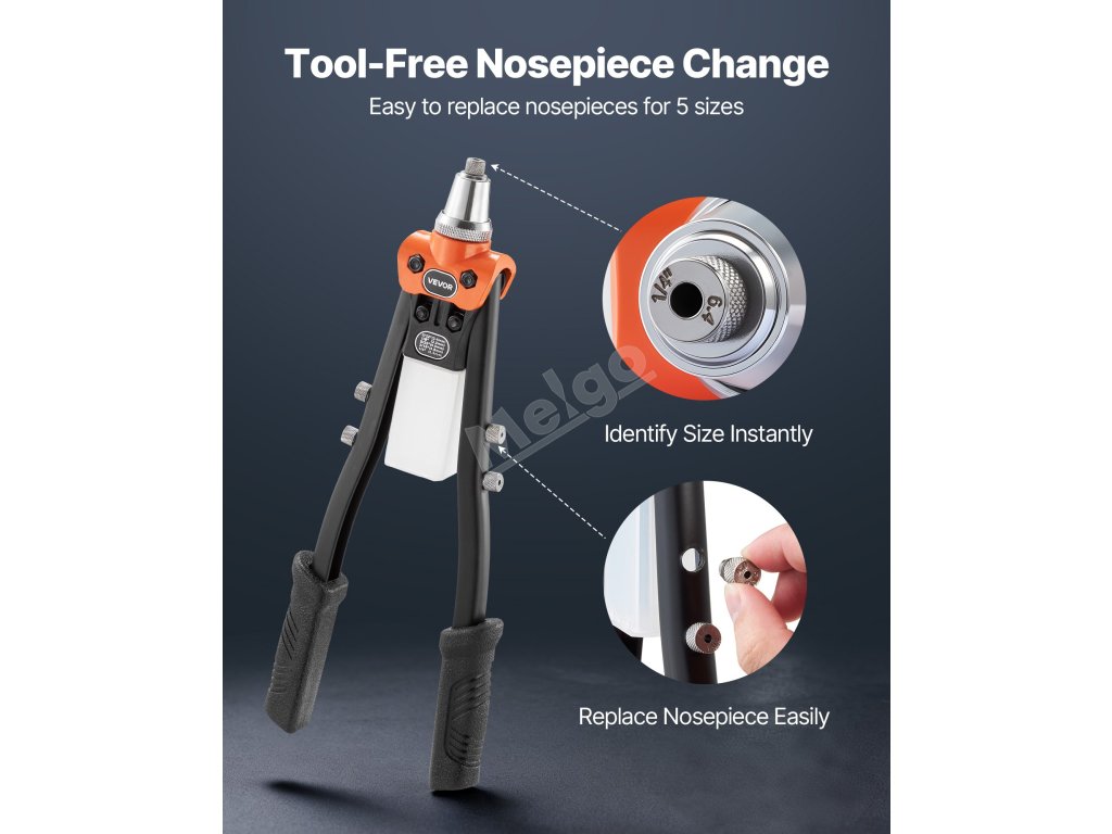 Když je čas na výměnu, je demontáž jednoduchá a čistá. Tato sada ruční nýtovací pistole vám umožní během několika sekund změnit velikost nebo odstranit záseky a udržet plynulost práce.