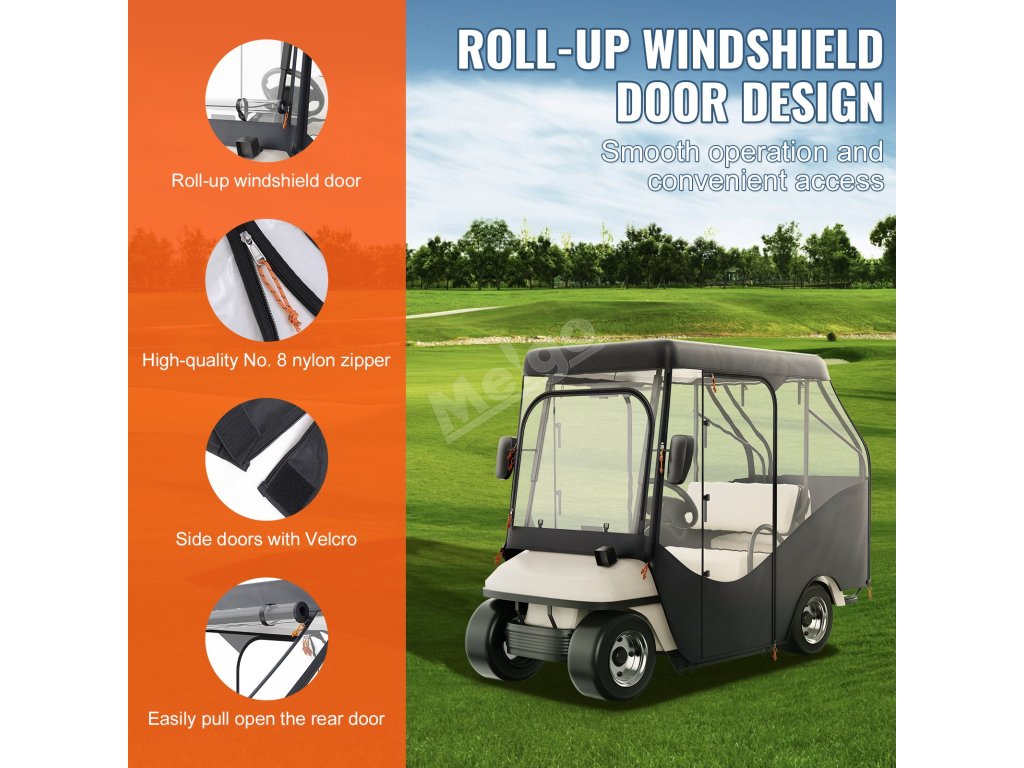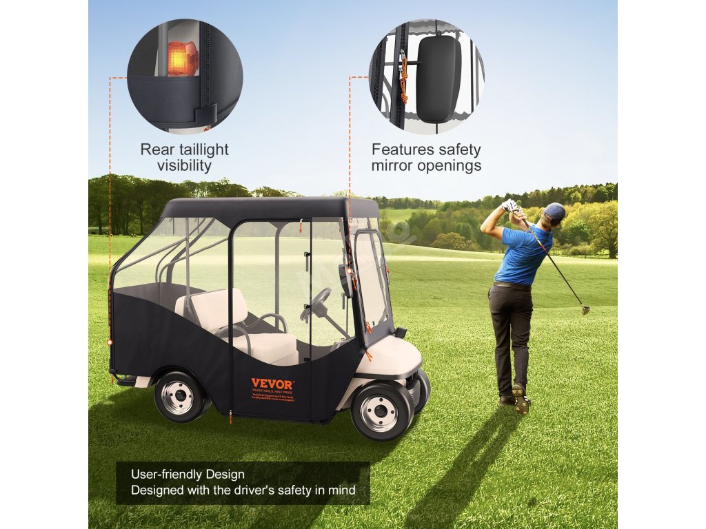 Konstrukce krytu umožňuje viditelnost zadních koncových světel, upozorňuje na protijedoucí vozidla a poskytuje uživatelům větší klid. Průduchy bezpečnostních zrcátek výrazně zvyšují bezpečnost a umožňují uživatelům, aby si byli vědomi svého okolí a jezdili bezpečně, když je kryt golfového vozu nasazen.