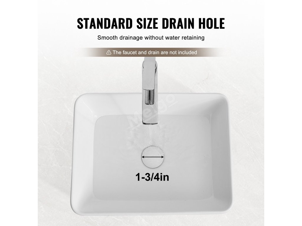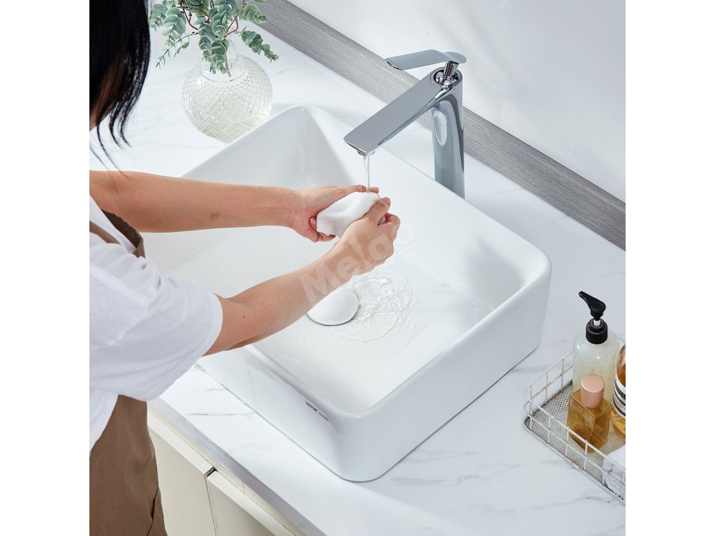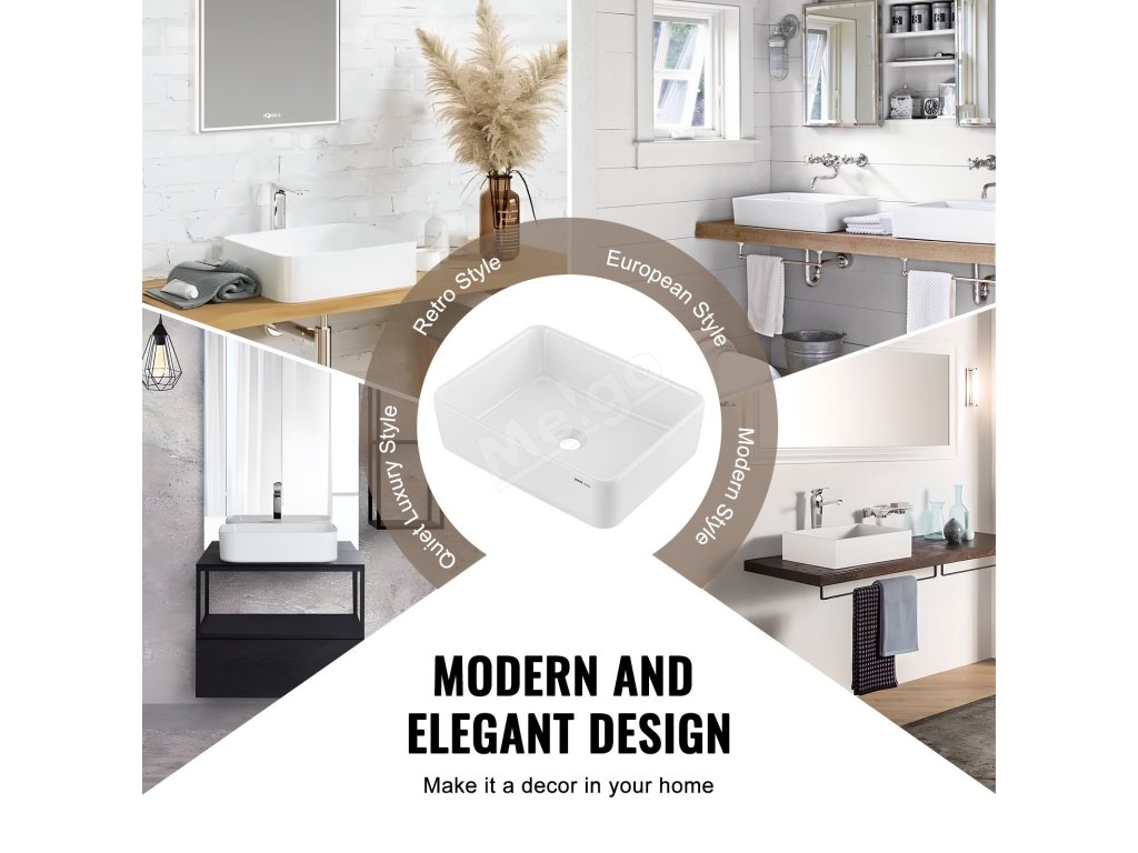 Tento dřez s minimalistickým obdélníkovým tvarem a decentní bílou barvou vyzařuje krásu a luxus. Doplní různé styly interiérů a mezi majiteli domů je oblíbené pro použití v koupelnách a toaletních stolcích. Hodí se také do hotelů, karavanů, restaurací, kancelářských budov a dalších prostor.