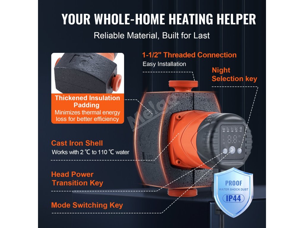 Toto oběhové čerpadlo teplé vody má dva robustní gumové těsnicí kroužky, které zabraňují únikům v místech připojení, chrání váš topný systém před poškozením vodou a pomáhají vám vyhnout se zbytečným opravám nebo plýtvání vodou.