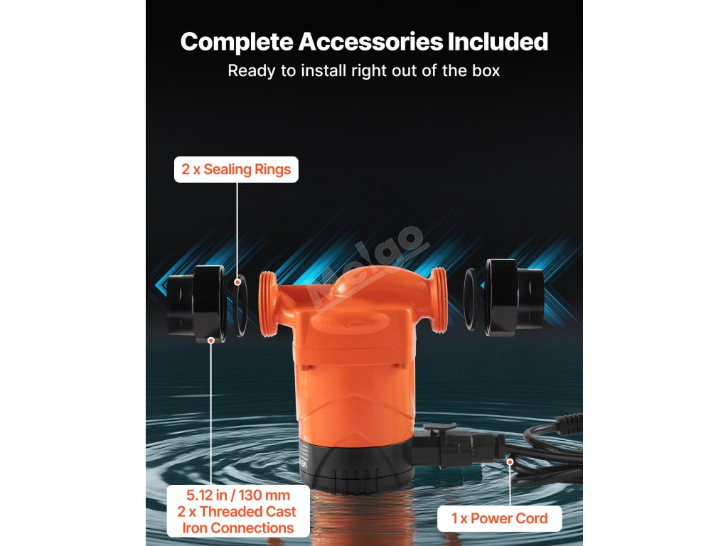 Dodává se s kompletní sadou instalačního příslušenství - není třeba dokupovat další příslušenství. Toto oběhové čerpadlo umožňuje flexibilní instalaci s domácími spotřebiči, průmyslovými zařízeními a plynovými systémy.