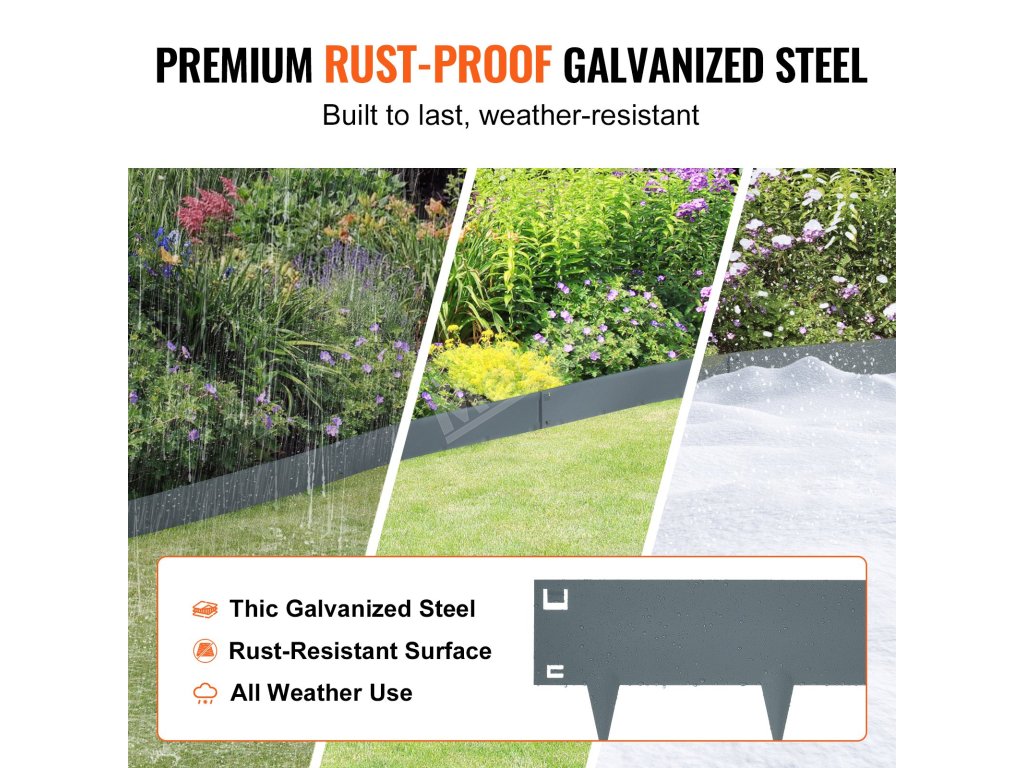 Zahradní okraj je vyroben z válcovaného plechu o tloušťce 0,06", který odolává blednutí, praskání a korozi a zajišťuje odolnost i v náročných povětrnostních podmínkách. Vyznačuje se vynikající odolností proti korozi a je trvanlivý i v blátivém terénu.