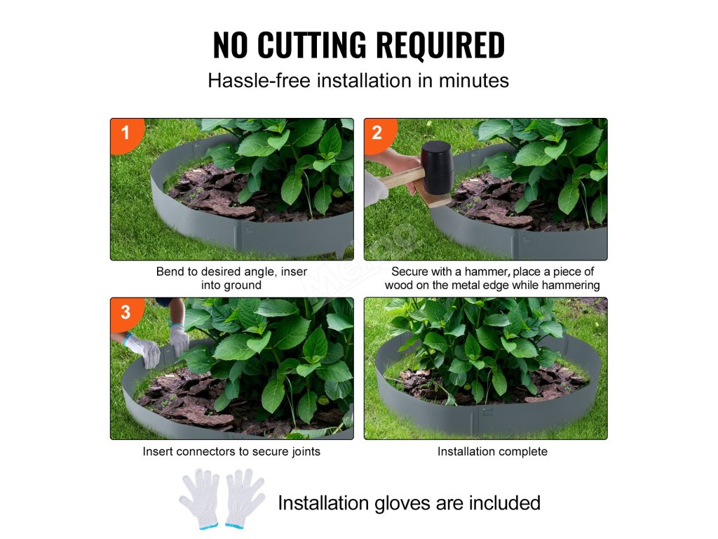 Stačí ohnout ocelové zahradní obruby do požadovaného úhlu, zasunout je do země, zajistit kladivem a poté je spojit. Nepotřebujete žádné složité nářadí ani odbornou pomoc.