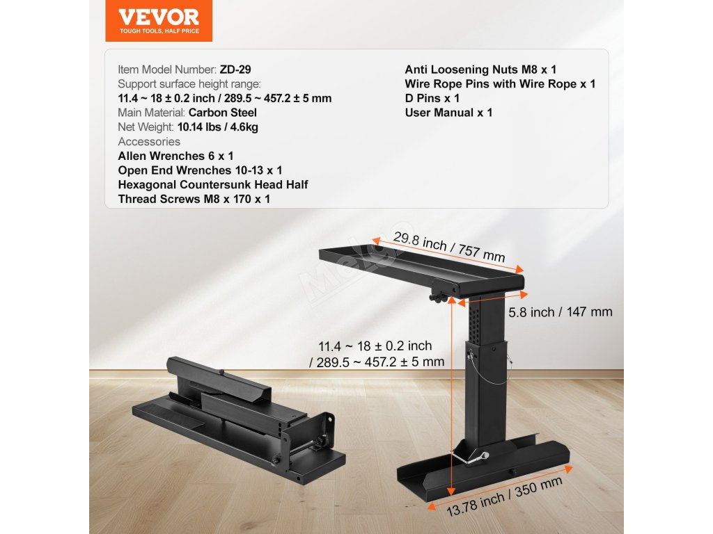 | Rozsah výšky podpornej plochy | 11.4 - 18 ± 0,2 palca / 289,5 - 457,2 ± 5 mm |
