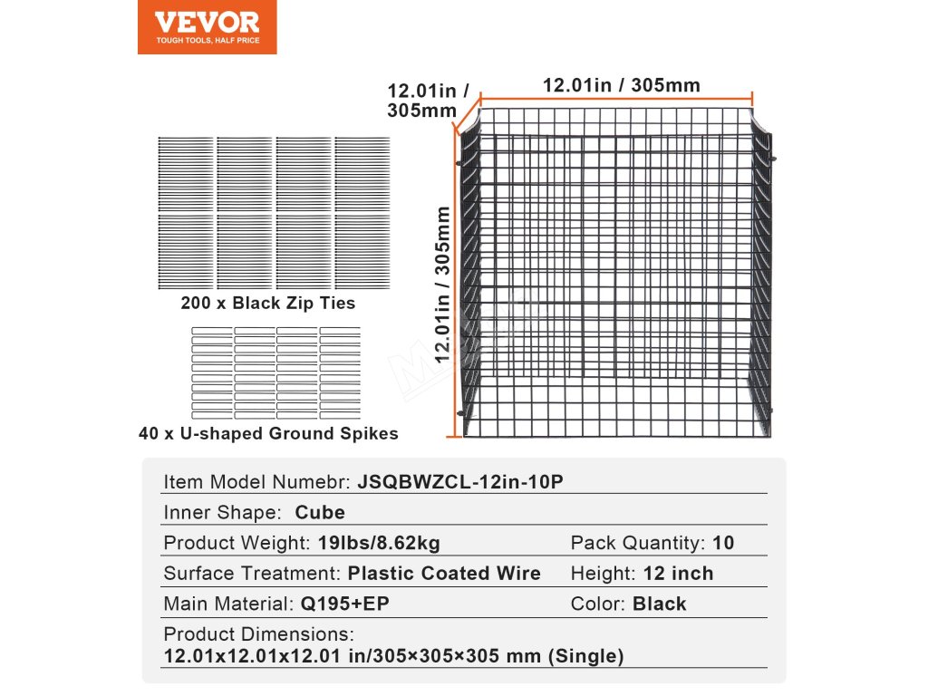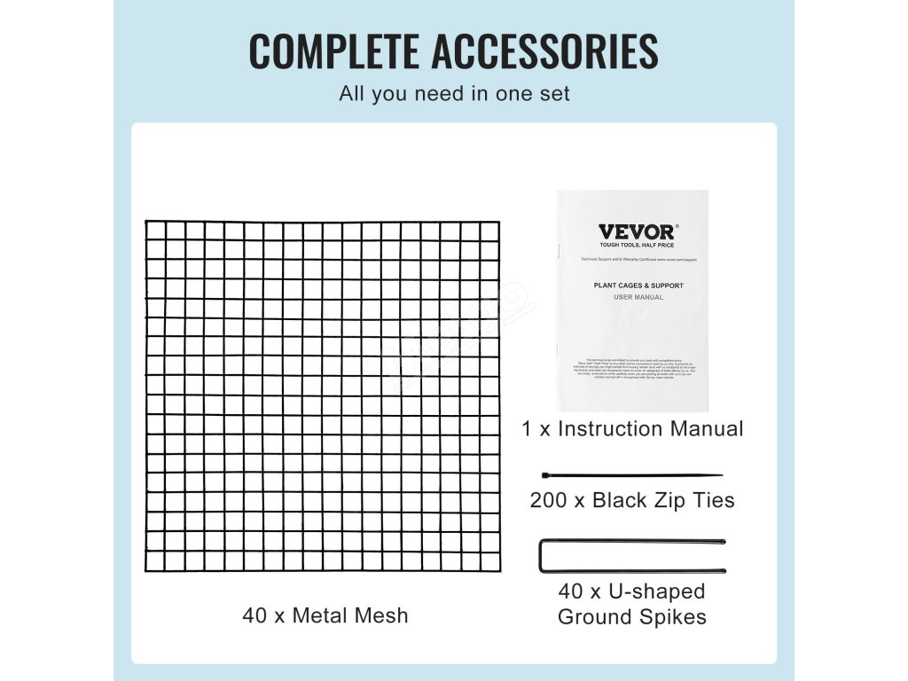 Sada na ochranu rostlin z pletiva obsahuje 40 kusů kovového pletiva, 200 černých stahovacích pásků, 40 zemních hrotů ve tvaru U a návod. Každá součást je jemně kovaná pro zajištění tvrdosti a odolnosti proti korozi, což zaručuje dlouhou životnost.